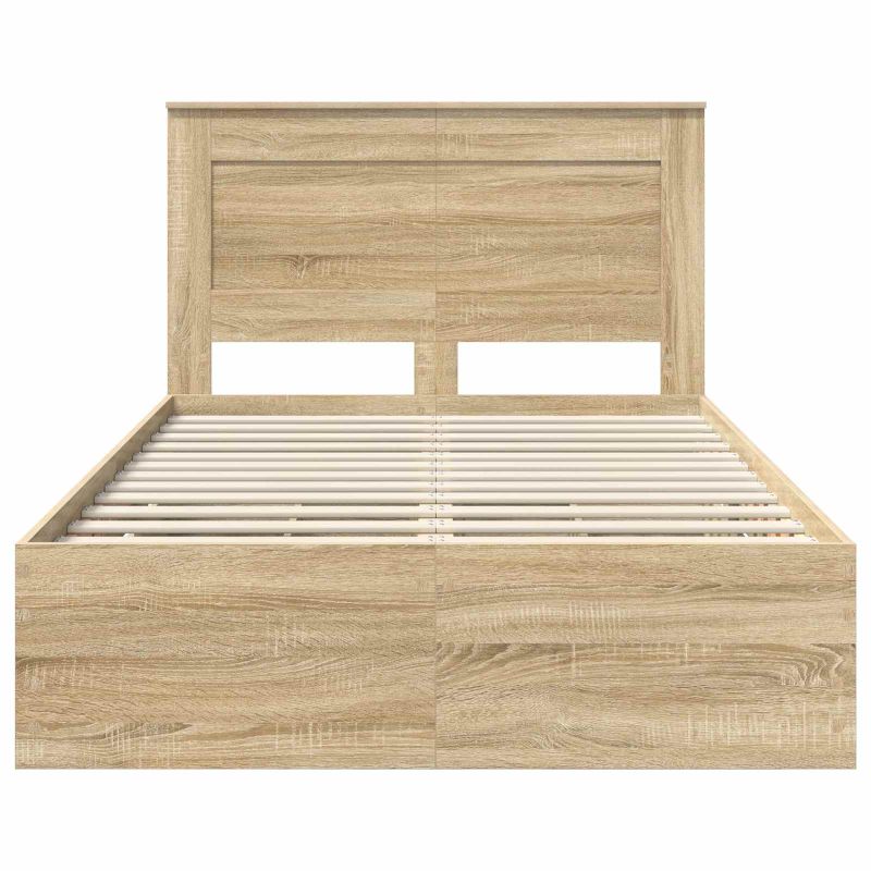 Dieses moderne Bettgestell bringt Eleganz mit einem schlanken, minimalistischen Design für zeitgemäße Räume. Es hat eine schlanke Form, die sich ganz einfach in jeden Schlafzimmerstil integriert. Hauptsächlich aus Holzwerkstoff gemacht, verbindet es Stil mit Langlebigkeit und ist eine luxuriöse, trotzdem praktische Ergänzung für dein Zuhause. Die stabile Lattenbasis sorgt dafür, dass deine Matratze immer optimal unterstützt wird und du jede Nacht gut schlafen kannst. Robustes Holzwerkstoff: Hergestellt aus hochwertigem Holzwerkstoff, kombiniert dieses Bettgestell Qualität und Stil. Es ist abriebfest und macht lange Freude, ohne dass es an visueller Anziehungskraft verliert, und unterstützt Standardmatratzen im perfekten Maße. Integriertes Kopfteil: Das Kopfteil aus Holzwerkstoff sorgt für einen einheitlichen Look. Es sieht schick aus und bietet auch Komfort beim stressfreien Sitzen und Lesen. Versteckte Schubladen: Dieses Bettgestell hat praktische, versteckte Schubladen, die viel Stauraum bieten. Ideal für kleine Räume, wo man clevere Lösungen braucht. Modernes Design: Einfachheit trifft auf Funktionalität — das Bettgestell hat klare Linien und quadratische Beine, perfekt für minimalistische Schlafzimmer. Es steht frei im Raum und braucht keine Wandstütze, was es sehr flexibel macht. Einfache Pflege: Dieses Bettgestell hält man ganz leicht in Schuss. Einfach mit einem feuchten Tuch abwischen, um Staub zu entfernen. Es passt super in jedes moderne Schlafzimmer und bleibt einladend und schick, wie am ersten Tag.
