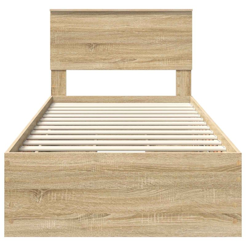 Dieser moderne Bettrahmen besticht durch schlankes und funktionales Design mit klaren Linien und minimalen Verzierungen. Er fügt sich nahtlos in den zeitgenössischen Stil von Schlafzimmern ein und sorgt als subtiler Blickfang für eine elegante Atmosphäre. Der Rahmen bietet eine stabile Grundlage für deinen Schlaf und verknüpft Komfort mit durchdachter Gestaltung. Er erfüllt die modernen Anforderungen und ist ein unverzichtbares Element in jedem Schlafzimmer. Holzwerkstoffrahmen: Der Rahmen besteht aus hochwertigem Holzwerkstoff, der für Langlebigkeit und Abriebfestigkeit bekannt ist. Er bietet zuverlässige Unterstützung für alle Matratzentypen und verleiht dem Schlafzimmer einen modernen Look. Die natürliche Widerstandsfähigkeit sorgt für langanhaltende Attraktivität. Geheime Staufächer: Diese versteckten Fächer im Bettgestell bieten diskrete Aufbewahrung für persönliche Sachen oder Bettwäsche. Sie helfen, für Ordnung zu sorgen, ohne die Zugänglichkeit zu beeinträchtigen. Moderner minimalistischer Stil: Mit seiner klaren Form und minimalen Verzierungen passt der Rahmen zu vielen Dekorstilen und integriert sich mühelos in verschiedene Inneneinrichtungen. Fester Lattenrost: Der stabile Lattenrost sorgt für eine gleichmäßige Gewichtsverteilung und erhält den Komfort während der Nacht, während das einfache Design die Funktionalität maximiert. Pflege & Wartung: Der Bettrahmen ist pflegeleicht und braucht nur ein Abwischen mit einem feuchten Tuch, um sein makelloses Aussehen zu bewahren.