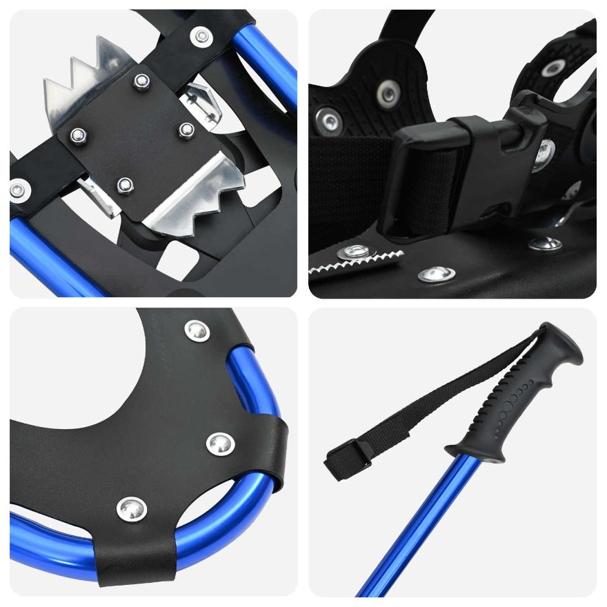 Dieses 3 IN 1 moderne Schneeschuhset mit Wanderstöcken ist perfekt für alle, die den Winter und Abenteuer im Schnee lieben. Es steht für einfache Handhabung und Funktionalität und verspricht ein leichtes Gleiten über schneebedeckte Wege, ideal für Outdoor-Fans. Durch sein modernes Design spricht es sowohl Anfänger als auch erfahrene Schneeschuhwanderer an, die nach Freiheit und Aufregung suchen. Aluminiumrahmen & Polyethylenboden: Robust und langlebig, hält der Aluminiumrahmen auch rauen Bedingungen stand. Die Kältebeständigkeit sorgt dafür, dass du sicher durch den Schnee kommst. Komplettset: Enthält ein Paar Schneeschuhe, zwei verstellbare Wanderstöcke und eine Tragetasche. Ideal für jeden, der alles für sein Schneewander-Abenteuer in einem Paket sucht. Alles ist leicht zu transportieren und zu lagern, damit du immer für Abenteuer gewappnet bist. Kältebeständige Eigenschaften: Der HDPE-Boden ist perfekt für kalte Umgebungen, und der verstellbare Fersenriemen sorgt dafür, dass deine Füße gut sitzen. So bleibst du auf jedem Terrain sicher und kontrolliert. Vielseitige Nutzung: Ob beim Wandern auf den Bergen oder in versteckten Wäldern, die Schneeschuhe passen von Größe 38 bis 48 und das Ratschen-System bietet eine flexible Anpassung für verschiedene Nutzer. Einfache Pflege: Bewahre die Ausrüstung an einem kühlen, trockenen Ort auf und wische sie mit einem trockenen Tuch ab, um sie in Top-Zustand zu halten. Vermeide den Gebrauch auf Asphalt, um den Boden zu schonen, und überprüfe sie vor jeder Wintersaison.