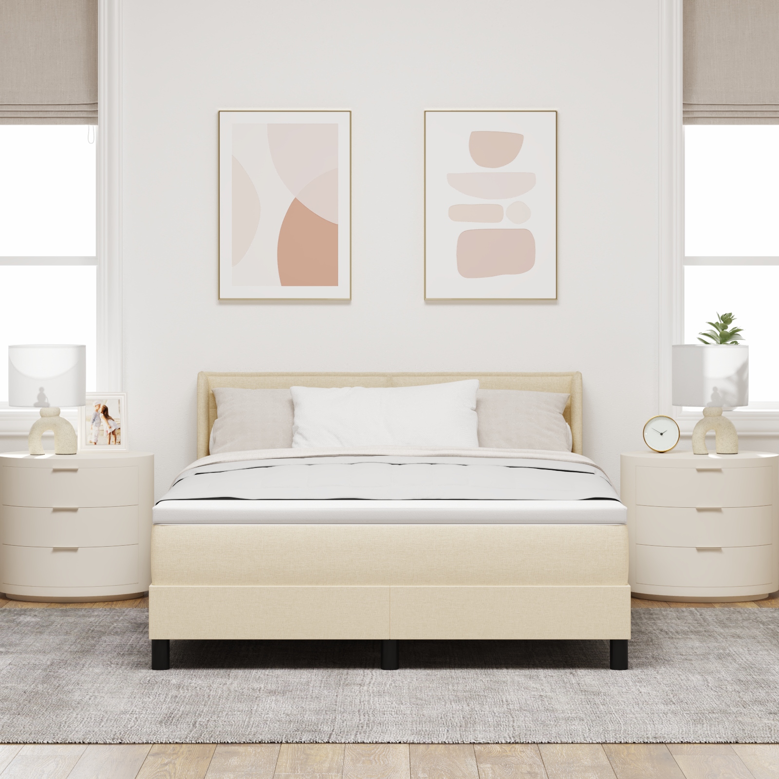 Dieses Boxspringbett vereint Komfort und modernen Stil, mit einem schicken cremefarbenen Finish, das zu verschiedenen Dekoren passt. Mit dem höhenverstellbaren Kopfteil kannst du die perfekte Schlafposition finden und stilvollen Ausdruck in dein Zimmer bringen. Modernes Design: Der zeitgenössische Stil dieses Bettes zieht alle Blicke an und passt zu jeder Schlafzimmerdekoration. Höhenverstellbar: Stelle das Kopfteil nach deinen Komfortbedürfnissen ein und gestalte dein Schlaferlebnis individuell. Abnehmbarer Bezug: Das Bett kommt mit einem waschbaren Bezug, der die Pflege und Hygiene erleichtert. Langlebige Materialien: Aus hochdichtem Schaumstoff und freundlicher Polsterung gefertigt, steht dieses Bett für Komfort und dauerhafte Nutzung. Ideale Größe: Mit 160 x 200 cm passt dieses Bett ideal in größere Schlafzimmer, ohne auf Komfort zu verzichten.