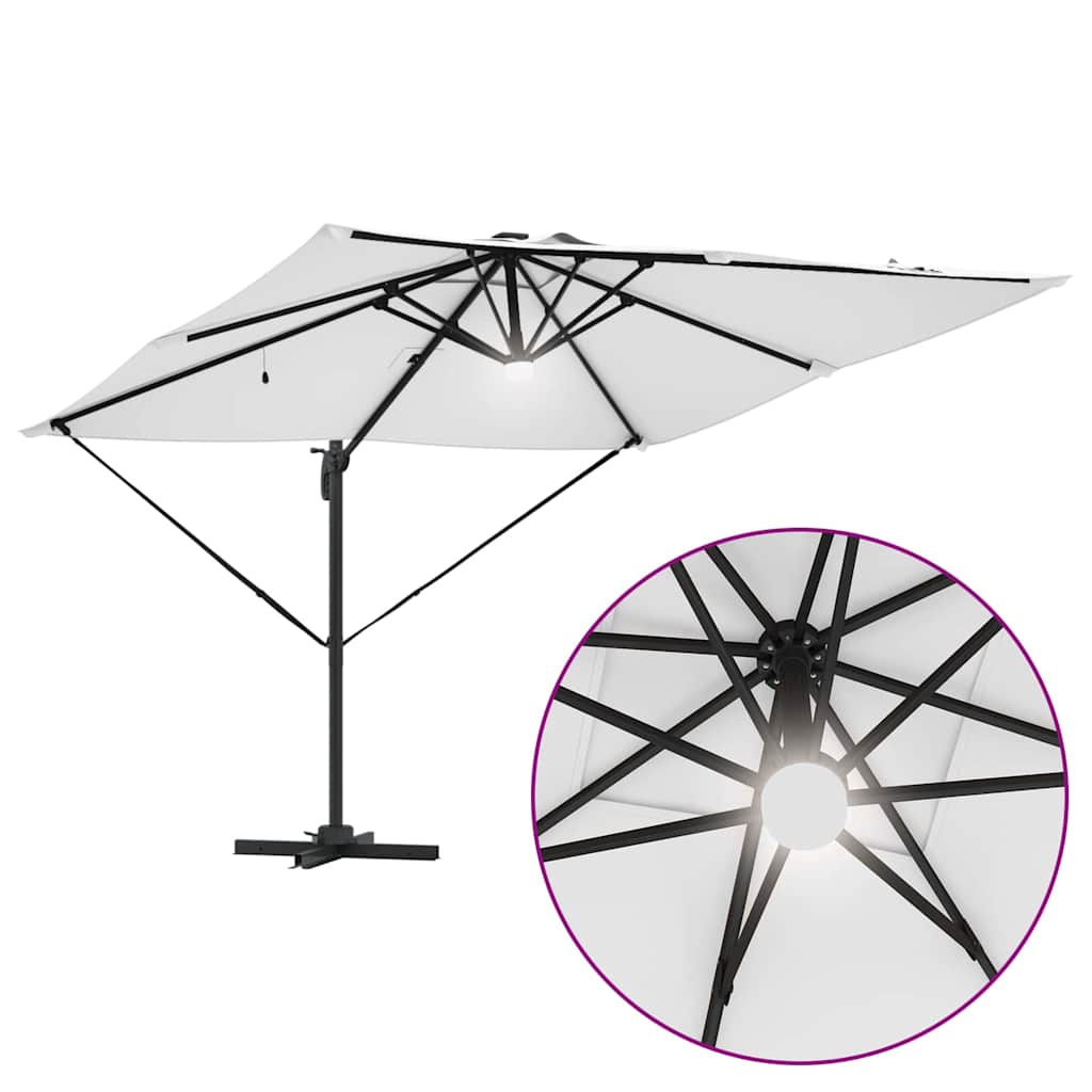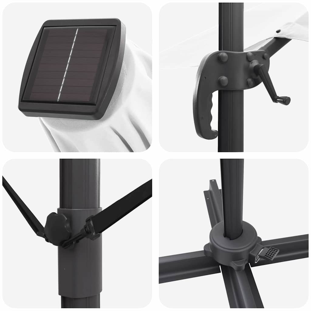 Dieser Freischwinger Sonnenschirm mit LEDs kombiniert Stil und Funktion und ist perfekt für alle, die ihre Außenbereiche aufwerten wollen. Das moderne Design bietet nicht nur viel Schatten, sondern sieht auch noch schick aus auf Patios, in Gärten oder auf Balkonen, was deine Zusammenkünfte angenehm macht, egal wie stark die Sonne scheint. Robuste Konstruktion: Aus Aluminium und Stahl gefertigt, ist dieser Sonnenschirm auf Langlebigkeit ausgelegt. Diese Materialien halten dem Wetter stand und sind gleichzeitig leicht zu transportieren. Windfeste Eigenschaften: Mit 2 Windschutzseilen ist dieser Sonnenschirm sehr stabil und die perfekte Wahl an windigen Tagen. Genieße deinen Außenbereich ohne Angst, dass er umkippt. Vielseitige Verstellbarkeit: Der Sonnenschirm lässt sich einfach mit einer Handkurbel öffnen und schließen und kann um 360° gedreht werden, sodass du ihn perfekt entsprechend der Sonneneinstrahlung positionieren kannst. Egal, ob du ihn neigen musst oder nicht, der Schatten ist immer nur eine einfache Handbewegung entfernt. Solarbetriebene LED-Beleuchtung: Die solarbetriebenen LEDs sorgen für eine gemütliche Atmosphäre und machen abendliches Verweilen im Freien angenehm. Diese Funktion macht deinen Bereich nicht nur einladend, sondern auch praktisch für Feiern. Große Abdeckungsfläche: Mit den Maßen L286 x W285 x H270 cm bietet dieser Sonnenschirm perfekten Schatten und ist ideal für Feiern im Freien oder einfach zum Entspannen in der Sonne.