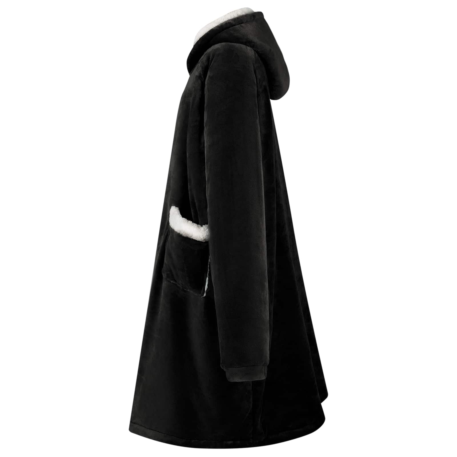 Dieser weiche Decken-Hoodie ist der Inbegriff von gemütlicher Wintermode, perfekt für entspannte Stunden drinnen in der kühlen Jahreszeit. Das oversized Design aus einer luxuriösen Fleece-Flanell-Mischung gibt dir eine sanfte Umarmung. Seine durchdachte Passform macht ihn ideal, um einen gemütlichen Abend auf der Couch zu verbringen, friedlich im Wohnzimmer zu lesen oder sogar als praktisches Kleidungsstück im Schlafzimmer. Material mit weicher Berührung: Dieser Decken-Hoodie aus einer kuscheligen Mischung aus Fleece und Flanell fühlt sich fantastisch auf der Haut an und bietet hohes Maß an Komfort. Der Stoff hält dich warm, ohne schwer zu sein, und sorgt für ein leichtes Gefühl, das beim Entspannen drinnen im Winter einfach klasse ist. Extra warme Kapuze: Die Kapuze bietet Wärme und Schutz für Kopf und Nacken. Ob beim Schlürfen eines heißen Getränks oder beim Lesen eines Buches, die Kapuze garantiert kuschelige Wärme und hüllt dich von Kopf bis Fuß ein. Praktische Tasche: Die Tasche ist super platziert und ermöglicht einfachen Zugriff auf dein Handy oder die Fernbedienung, ohne dass du deinen gemütlichen Platz verlassen musst. So wird der Hoodie noch funktionaler und sorgt für Komfort in deinen Entspannungsmomenten. Tragbares Design: Leicht und einfach zu transportieren, begleitet dich der Decken-Hoodie von Raum zu Raum und spendet dir überall Wärme. Beweg dich mühelos, während du das durchgehende warm und kuschelige Feeling genießen kannst. Einfache Pflege: Die Pflege deines Hoodies ist kinderleicht. Vermeide aggressive Chemikalien und Abrasive beim Waschen, damit der Stoff weich und lebendig bleibt. So kannst du seine Wärme ohne Sorgen genießen.