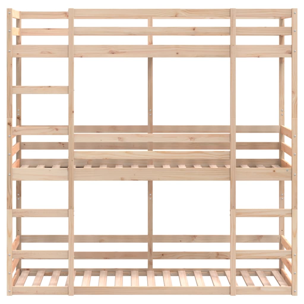 Dieses elegante und praktische Dreifach-Etagenbett aus Holz ist die perfekte Ergänzung zu jedem Zimmer mit begrenztem Platzangebot. Robust und stabil: Massives Kiefernholz ist für seine Stärke und Haltbarkeit bekannt. Seine gerade Maserung und die charakteristischen Aststellen tragen zu seinem rustikalen Charme bei.Rausfallschutz: Jedes Bett ist an allen 4 Seiten mit Schutzgittern versehen, um das Herausfallen während des Schlafs zu verhindern.Praktische Leiter: Die Leiter erleichtert den Einstieg ins obere Bett und bietet mehr Sicherheit und Stabilität.Optimale Raumnutzung: Dieses Dreierbett nutzt vertikalen Raum optimal aus und lässt sich leicht in separate Einzel- und Plattformbetten umbauen. Es eignet sich perfekt für große Familien oder spontane Übernachtungsgäste und wird den unterschiedlichsten Anforderungen gerecht. Gut zu wissen:Im Lieferumfang sind nur die Bettgestelle enthalten. Die Matratzen sind nicht Teil des Angebots. Passende Matratzen findest du in unserem Shop.Schrauben und Dübel für die Montage an der Wand sind nicht enthalten. Passendes Montagezubehör muss separat gekauft werden. Wenn du dir bezüglich der Montage nicht sicher bist, wende dich bitte an einen Fachmann. Bitte lies und befolge jeden Schritt in der Anleitung.