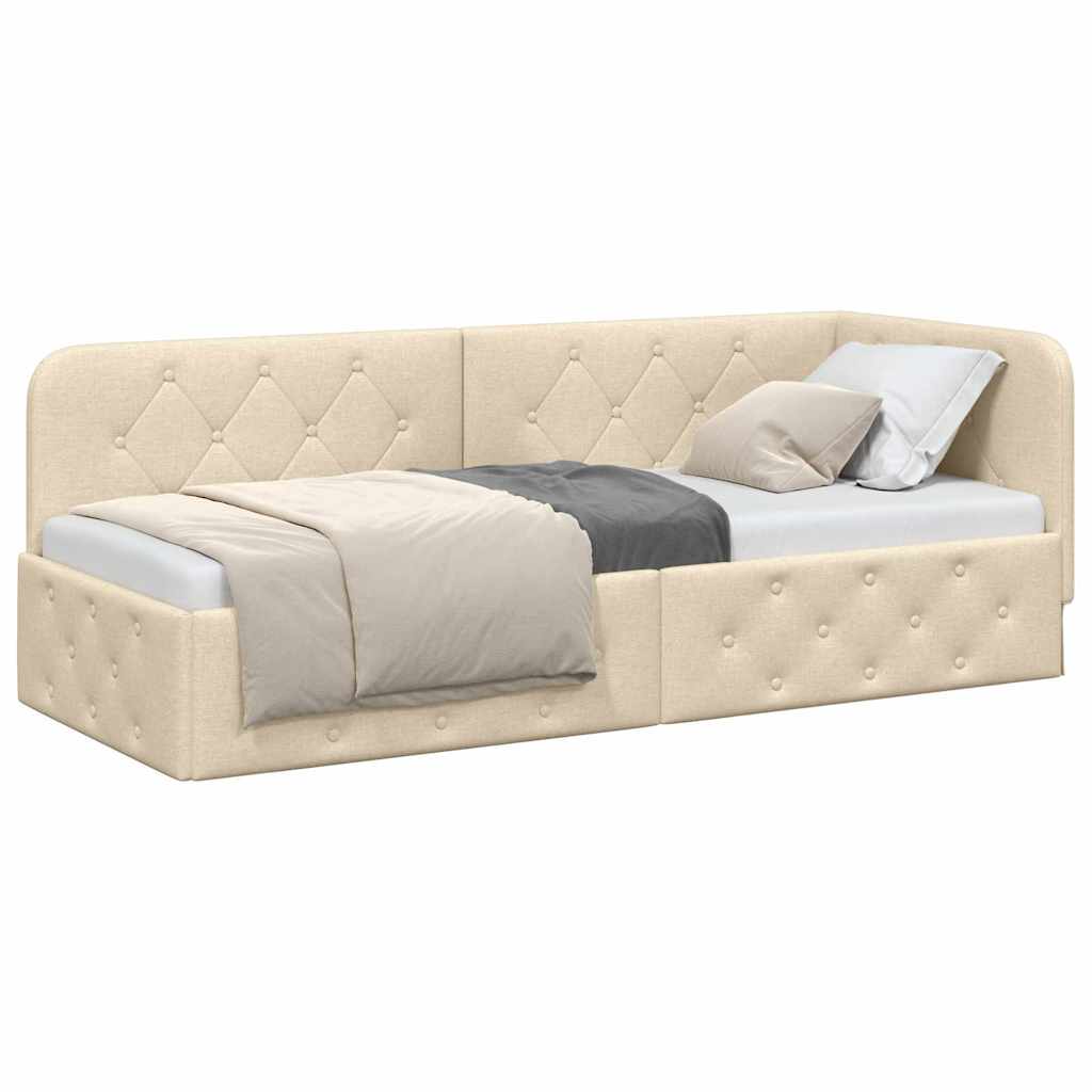 Dieses Stoff-Eckbettgestell hat ein smartes Design, das Stil und Funktionalität locker kombiniert und so perfekt für jedes moderne Schlafzimmer ist. Das platzsparende L-Design nutzt den Raum optimal und bietet eine gemütliche Sitz- und Schlaflösung. Mit klaren Linien und einem minimalistischen Look fügt sich dieser Tagesbettrahmen super in verschiedene Inneneinrichtungen ein, egal ob für stilbewusste Hausbesitzer oder für Leute, die praktische Lösungen für kleine Räume suchen. Materialien: Dieses Bett besteht aus schickem Stoff und robustem Sperrholz. Der atmungsaktive Stoff sorgt für Komfort und lädt zum Entspannen ein. Die Sperrholz-Komponenten geben stabile Unterstützung und garantieren Langlebigkeit. Enthaltene Komponenten: Der feste Lattenrost bietet eine stabile Basis, gesichert durch nicht flexible Holz- oder Metallleisten, die gleichmäßige Unterstützung leisten. Sein ergonomisches Design sorgt für Komfort und Benutzerfreundlichkeit, was es perfekt für erholsamen Schlaf oder entspannte Zeiten macht. Merkmale / Funktion / Design: Die L-Form nutzt den Raum innovativ und maximiert die Stellfläche im Schlafzimmer und bietet Flexibilität im Möbel-Layout. Die anpassbare Bett-Höhe von 31 cm sorgt für leichten Zugang und gute Nutzbarkeit. Empfohlene Verwendung: Dieses Bett funktioniert sowohl als Sofa als auch als Bett und ist flexibel einsetzbar. Sein moderner Stil passt in jede Einrichtung und ist perfekt für Wohnungen, Studios und multifunktionale Räume. Pflege & Wartung: Um das tolle Aussehen zu bewahren, einfach regelmäßig mit einem trockenen Tuch über den Stoff wischen. Scharfe Chemikalien vermeiden, um die Materialien nicht zu beschädigen.