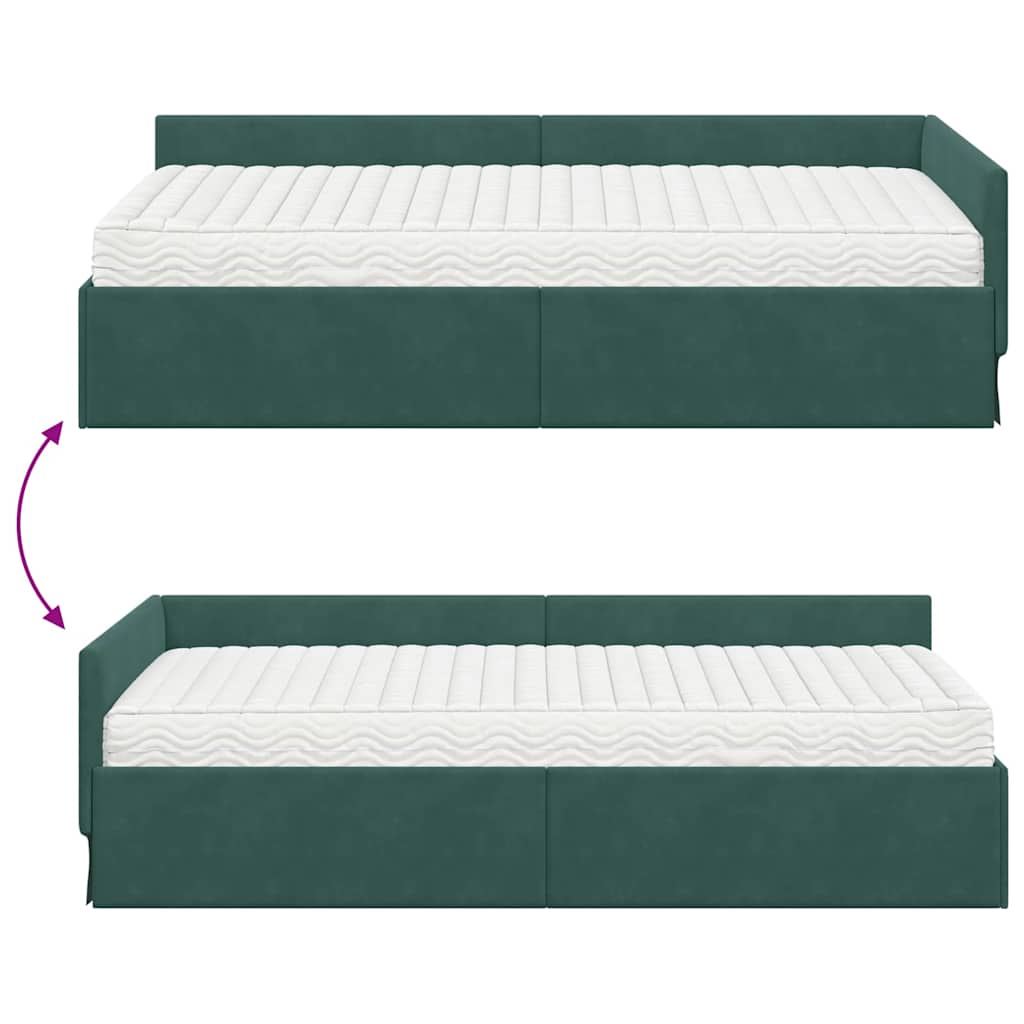 Das Samt-Eckbettgestell kombiniert modernen Stil mit praktischen Funktionen. Mit seinem schlanken Design ist es die perfekte Ergänzung für jedes Schlafzimmer und fügt sich nahtlos in die heutige Inneneinrichtung ein. Die luxuriöse Samtoberfläche sorgt nicht nur für schöne Akzente, sondern auch für angenehmen Komfort, damit du gut schläfst. Der schicke Look wird von einem weichen Unterbau und robuster Bauweise ergänzt, die den idealen Mix aus Stil und Unterstützung bietet, ganz gleich, wie du schläfst. Samt & Sperrholz-Konstruktion Luxuriöser Samt trifft auf robustes Sperrholz für eine stylische und langlebige Lösung. Der Rahmen ist nicht nur schick, sondern sorgt auch dafür, dass das Bett gut in jedes Schlafzimmer passt. Integrierte Matratze dabei Das Bett kommt mit einer mittelfesten Polyurethanmatratze, die alle Schlafpositionen unterstützt. Du erhältst so höchsten Komfort und einen schlafbereiten Platz, ohne zusätzlich kaufen zu müssen. Verstellbares Kopfteil Mit einem einstellbaren Mechanismus kannst du das Kopfteil ganz nach deinen Bedürfnissen anpassen - ob zum Entspannen, Lesen oder Schlafen. Das verbessert dein Schlaferlebnis erheblich! Atmungsaktives und langlebiges Design Aus atmungsaktiven Materialien sorgt das Bett für gute Luftzirkulation, damit du immer angenehm schläfst. Die robuste Bauweise garantiert Qualität und macht es zur tollen Ergänzung für jeden Raum. Einfache Pflege Mit einem trockenen Tuch abwischen reicht, um das makellose Aussehen zu erhalten. So bleibt der luxuriöse Look erhalten und das Bett sorgt über Jahre für Freude in deinem Zuhause.