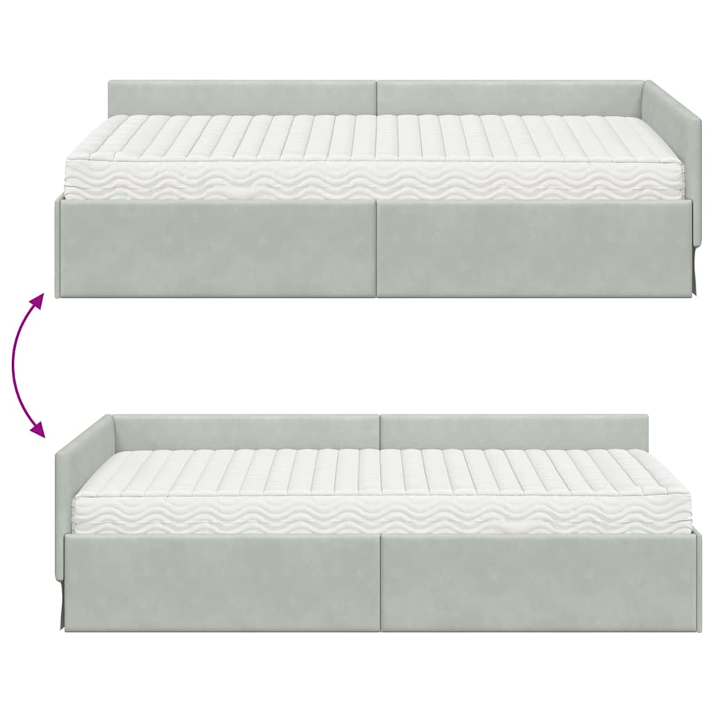 Das Samt-Eckbettgestell kombiniert modernen Stil mit praktischen Funktionen. Mit seinem schlanken Design ist es die perfekte Ergänzung für jedes Schlafzimmer und fügt sich nahtlos in die heutige Inneneinrichtung ein. Die luxuriöse Samtoberfläche sorgt nicht nur für schöne Akzente, sondern auch für angenehmen Komfort, damit du gut schläfst. Der schicke Look wird von einem weichen Unterbau und robuster Bauweise ergänzt, die den idealen Mix aus Stil und Unterstützung bietet, ganz gleich, wie du schläfst. Samt & Sperrholz-Konstruktion Luxuriöser Samt trifft auf robustes Sperrholz für eine stylische und langlebige Lösung. Der Rahmen ist nicht nur schick, sondern sorgt auch dafür, dass das Bett gut in jedes Schlafzimmer passt. Integrierte Matratze dabei Das Bett kommt mit einer mittelfesten Polyurethanmatratze, die alle Schlafpositionen unterstützt. Du erhältst so höchsten Komfort und einen schlafbereiten Platz, ohne zusätzlich kaufen zu müssen. Verstellbares Kopfteil Mit einem einstellbaren Mechanismus kannst du das Kopfteil ganz nach deinen Bedürfnissen anpassen - ob zum Entspannen, Lesen oder Schlafen. Das verbessert dein Schlaferlebnis erheblich! Atmungsaktives und langlebiges Design Aus atmungsaktiven Materialien sorgt das Bett für gute Luftzirkulation, damit du immer angenehm schläfst. Die robuste Bauweise garantiert Qualität und macht es zur tollen Ergänzung für jeden Raum. Einfache Pflege Mit einem trockenen Tuch abwischen reicht, um das makellose Aussehen zu erhalten. So bleibt der luxuriöse Look erhalten und das Bett sorgt über Jahre für Freude in deinem Zuhause.
