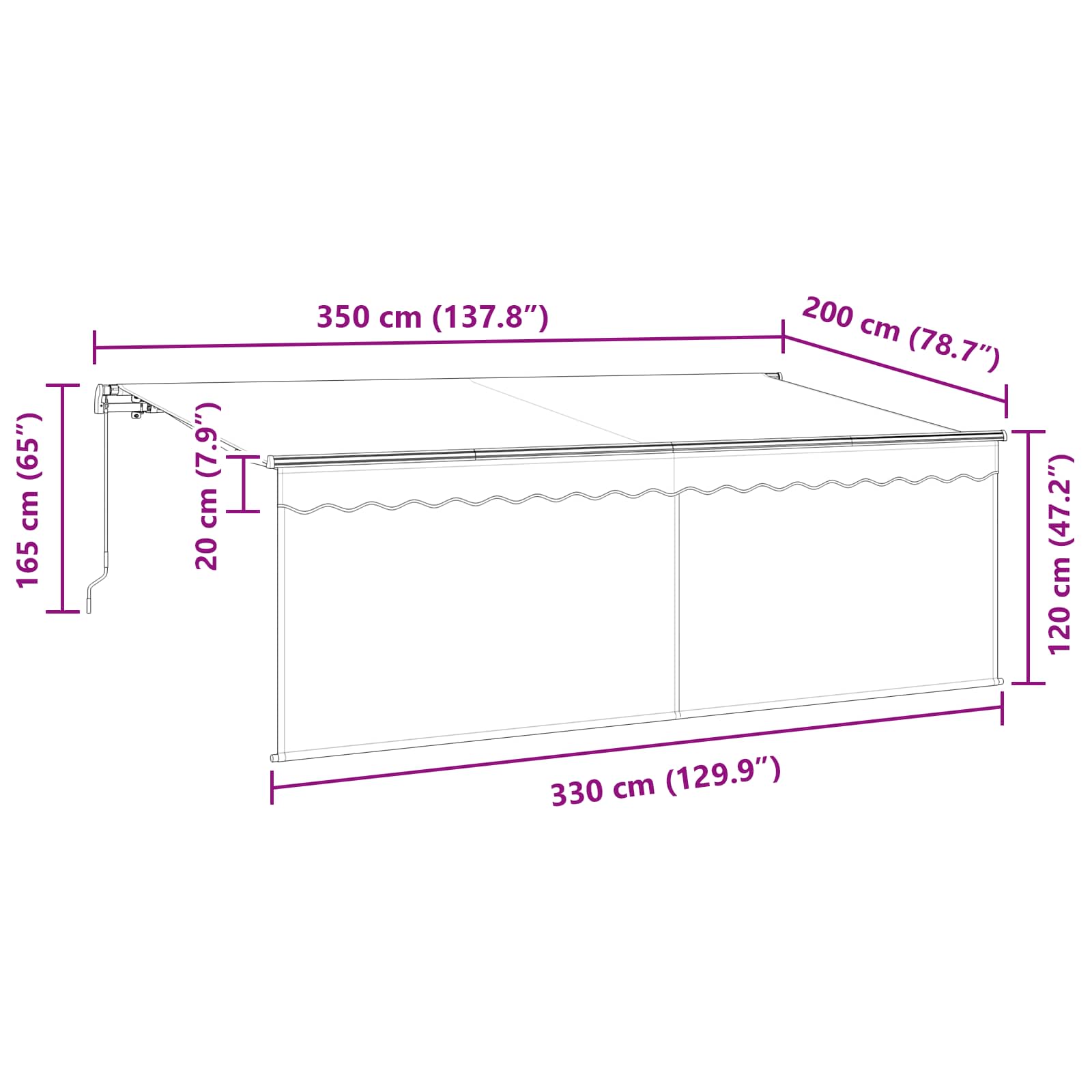 Diese einziehbare Markise hat einen modernen Look mit klaren Linien und nützlichen Funktionen – perfekt für die Verschönerung von Außenbereichen wie Gärten und Terrassen. Sie hat die elegante Form eines Rechtecks mit 350 x 200 cm und passt super in zeitgenössische Umgebungen, bietet wichtigen Schatten und Schutz. Ihr anthrazitfarbener Look sieht klasse aus und erweitert optisch dein Wohnumfeld. Hochwertige Materialien: Diese Markise besteht aus strapazierfähigem Polyesterstoff und stabilem Aluminium. So hast du Langlebigkeit und Widerstandsfähigkeit gegen den täglichen Gebrauch. Die UV-beständigen Eigenschaften schützen sie vor Sonnenlicht und bringen sie nicht um, sodass du ein dauerhaftes Gartenstück erhältst. Umfassende Komponenten: In der Lieferung ist der Markisenrahmen, der Stoff und eine Blende enthalten, sodass du sofort loslegen kannst. Das macht den Aufbau einfach, damit du deinen schattigen Platz ohne große Verzögerung genießen kannst und du dir keine Sorgen über Kompatibilität machen musst. Modernes Design und Funktionalität: Mit einem einziehbaren Mechanismus passt sich die Markise deinem Schatten- und Sonnenlichtexposition an – perfekt für unterschiedliche Bedürfnisse zu jeder Tageszeit und Wetterlage. Ihr schlankes Design fügt sich super in eine moderne Einrichtung ein und verstärkt die Harmonie in deinem Außenbereich. Vielseitige empfohlene Anwendungen: Egal ob für Feiern, Essen oder Entspannung im Freien, diese Markise sorgt für mehr Komfort auf Terrassen, in Gärten oder anderen Außenwohnräumen. Sie wurde entwickelt, um an sonnigen Tagen optimalen Schutz zu bieten und es dir zu ermöglichen, deinen Außenbereich auch bei Sonne zu genießen. Wesentliche Pflege und Wartung: Halte die Oberfläche einfach sauber, indem du gelegentlich mit einer weichen Bürste drüber gehst. Vermeide aggressive Chemikalien, um die Materialqualität zu erhalten und damit die Attraktivität und Funktionalität länger bestehen bleibt. Mach sie zum Highlight eines durchdachten Outdoor-Erlebnisses.