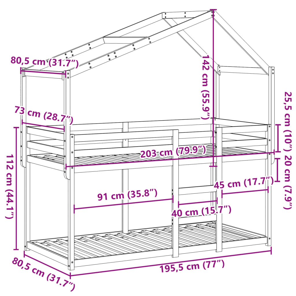 Dieses elegante und praktische Etagenbett mit Dach ist die perfekte Ergänzung zu jedem Kinderzimmer mit begrenztem Platzangebot. Massives Kiefernholz: Massives Kiefernholz ist ein wunderschönes Naturmaterial. Kiefernholz weist eine gerade Maserung auf und die Aststellen verleihen dem Material seine charakteristische, rustikale Optik.Sicheres Design: Das Hochbett ist auf Sicherheit ausgelegt. Es verfügt über Leitplanken, um zu verhindern, dass du während des Schlafens herausfällst.Sperrholzlatten: Die Sperrholzlatten sorgen für eine gute Gewichtsverteilung und auch dafür, dass die Matratze bei jeder Bewegung deines Körpers während des Schlafes an Ort und Stelle bleibt.Viel Spaß: Durch das Anbringen dieses Dachgestells am Kinderbett kannst du einen Rückzugsort schaffen, der deinem Kind viel Spaß vor dem Schlafengehen bietet. Diese innovative Ergänzung wird nicht nur ein spannender Blickfang sein, sondern auch für Staunen und Spannung im Kinderzimmer sorgen.Geeignet für begrenzte Platzverhältnisse: Der Bettrahmen ist eine ausgezeichnete Wahl für jedes Zimmer mit begrenztem Platz, es bietet zwei einzelne Betten mit kompaktem Design.Offene Seite: Das Dach verfügt über eine offene Seite, die den Kindern den Ein- und Ausstieg erleichtert, Gut zu wissen:Bei diesem Bett ist keine Matratze im Lieferumfang enthalten. Wir bieten jedoch eine große Auswahl an Matratzen an. Du kannst in unserem Shop nach einer passenden Matratze suchen.