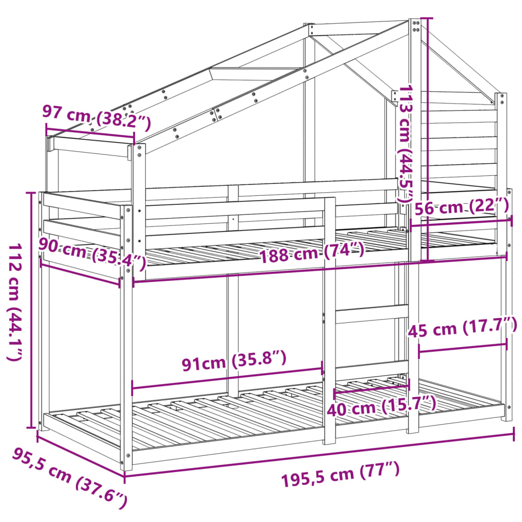 Dieses elegante und praktische Etagenbett mit Dach ist die perfekte Ergänzung zu jedem Kinderzimmer mit begrenztem Platzangebot. Massives Kiefernholz: Massives Kiefernholz ist ein wunderschönes Naturmaterial. Kiefernholz weist eine gerade Maserung auf und die Aststellen verleihen dem Material seine charakteristische, rustikale Optik.Sicheres Design: Das Hochbett ist auf Sicherheit ausgelegt. Es verfügt über Leitplanken, um zu verhindern, dass du während des Schlafens herausfällst.Sperrholzlatten: Die Sperrholzlatten sorgen für eine gute Gewichtsverteilung und auch dafür, dass die Matratze bei jeder Bewegung deines Körpers während des Schlafes an Ort und Stelle bleibt.Viel Spaß: Durch das Anbringen dieses Dachgestells am Kinderbett kannst du einen Rückzugsort schaffen, der deinem Kind viel Spaß vor dem Schlafengehen bietet. Diese innovative Ergänzung wird nicht nur ein spannender Blickfang sein, sondern auch für Staunen und Spannung im Kinderzimmer sorgen.Geeignet für begrenzte Platzverhältnisse: Der Bettrahmen ist eine ausgezeichnete Wahl für jedes Zimmer mit begrenztem Platz, es bietet zwei einzelne Betten mit kompaktem Design.Offene Seite: Das Dach verfügt über eine offene Seite, die den Kindern den Ein- und Ausstieg erleichtert, Gut zu wissen:Bei diesem Bett ist keine Matratze im Lieferumfang enthalten. Wir bieten jedoch eine große Auswahl an Matratzen an. Du kannst in unserem Shop nach einer passenden Matratze suchen.