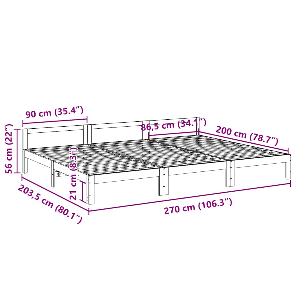Mit diesem Familienbett wirst du einen besseren, erholsameren Schlaf genießen! Er ist eine einladende Ergänzung für jedes Schlafzimmer. Stabiles und langlebiges Gestell: Massives Kiefernholz ist für seine Stärke und Haltbarkeit bekannt. Seine gerade Maserung und die charakteristischen Aststellen tragen zu seinem rustikalen Charme bei.Kein Boxspringbett erforderlich: Der Bettgestell ist mit einem Lattenrost ausgestattet, der deiner Matratze eine hervorragende Unterstützung und Atmungsaktivität bietet, sodass du kein Boxspringbett mehr benötigst.Geräumiger Komfort: Dieses Familienbett bietet eine geräumige Liegefläche von 270x200 cm, sodass die ganze Familie bequem schlafen kann, ohne sich eingeengt zu fühlen. Außerdem kannst du dank der vorgebohrten Löcher im Bettgestell weitere Einzelbetten hinzufügen, um einen größeren Schlafplatz zu schaffen.Vielseitiges Kopfteil: Dieses Bettgestell ist mit einem Kopfteil versehen, das als komfortable Rückenstütze beim Lesen oder Fernsehen und gleichzeitig als dekoratives Element dient.Stabile und starke Bettfüße: Dieses Bett wird von stabilen Füßen getragen, die für Stabilität und sicheren Halt sorgen.