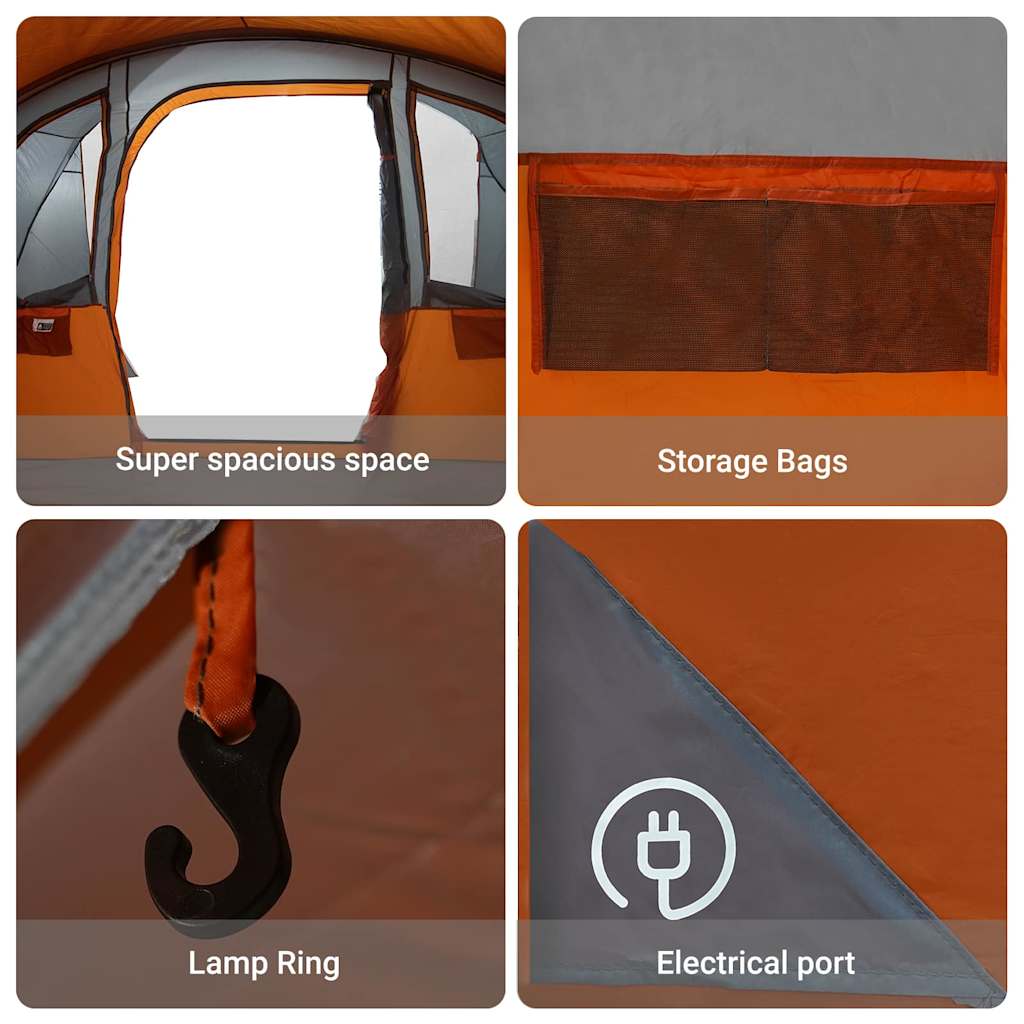Dieses graue und orange 8-Personen Campingzelt ist ein super Outdoor-Unterschlupf, der viel Platz für deine Freunde oder Familie beim Camping bietet. Mit seinem modernen Look und praktischen Vorteilen sorgt es für ein bequemes und unterhaltsames Camping-Erlebnis, perfekt für Sommerfestivals, Outdoor-Abenteuer oder schnelle Ausflüge. Das geräumige Layout bietet bequem Platz für bis zu acht Erwachsene und hat viel Raum für deine Ausrüstung. Hergestellt aus hochwertigem Polyester und Fiberglas, hält es verschiedenen Wetterbedingungen stand, dank der wasserdichten und UV-beständigen Eigenschaften. Die Einrichtung ist kinderleicht mit den im Lieferumfang enthaltenen Bodenheringen und Schnüren, um das Zelt draussen stabil zu halten. Netzfenster sorgen für gute Belüftung, lassen Licht und frische Luft rein und verhindern, dass sich Hitze und Feuchtigkeit im Inneren stauen. Der Reißverschluss ermöglicht einen einfachen Zugang ins Innere und schützt deine Sachen vor den Elementen.