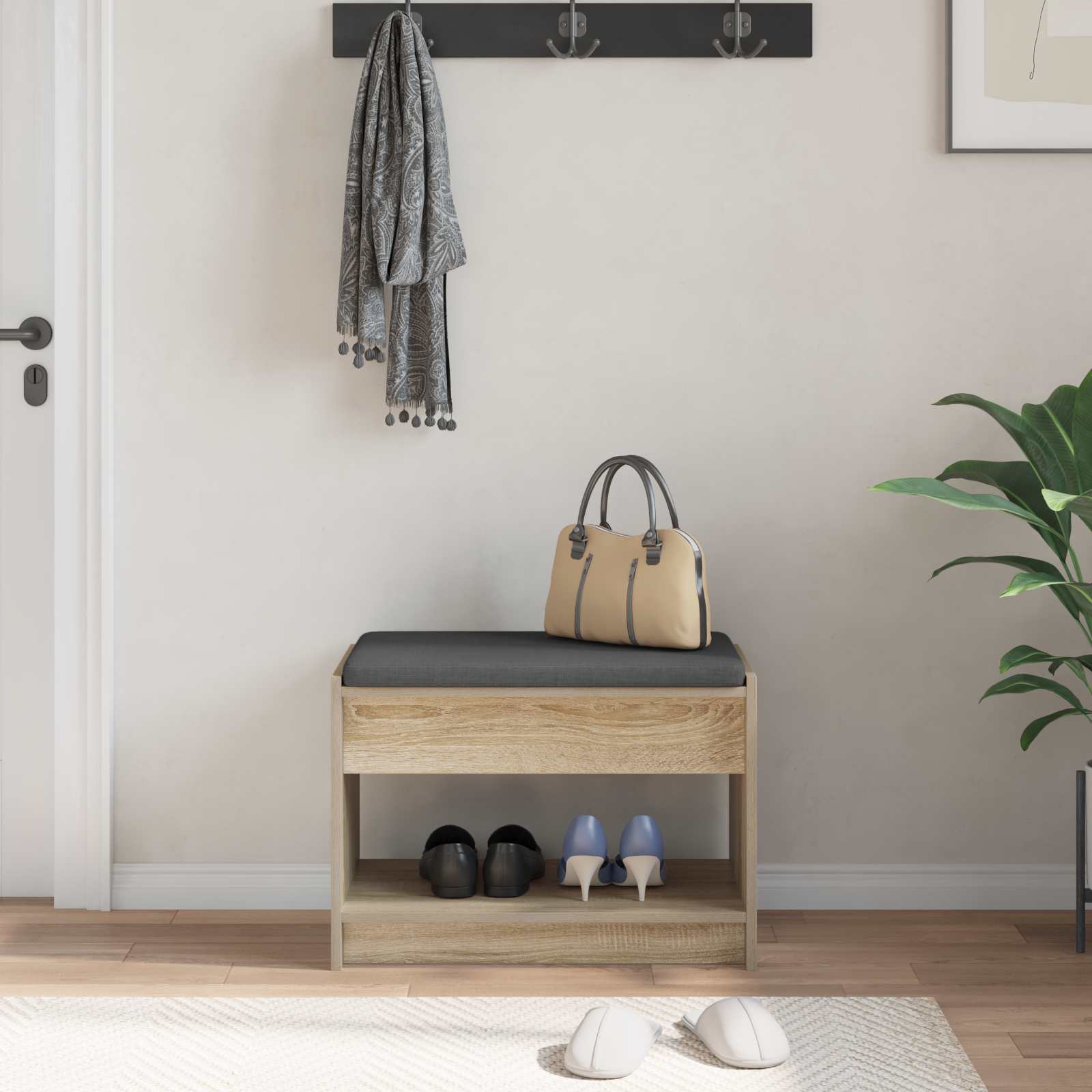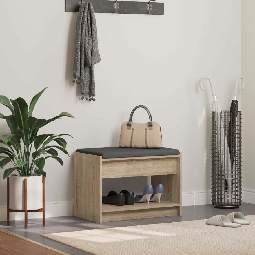 Diese moderne Flurbank vereint Stil und Funktionalität in einem eleganten, rückenlosen Design. Sie wertet jeden modernen Flur oder Eingangsbereich auf. Hergestellt aus robustem Holzwerkstoff und mit sanfter Stoffpolsterung kombiniert sie ästhetischen Reiz mit Komfort – der perfekte Platz zum Schuhe anziehen oder zum Ablegen von Dingen. Die zeitgenössische Silhouette fügt sich nahtlos in verschiedene Einrichtungsstile ein und bringt einen Hauch von minimalistischer Eleganz in deine Wohnung. Design aus Holzwerkstoff Die Flurbank ist aus hochwertigem Holzwerkstoff gefertigt, was eine solide Bauweise garantiert und gleichzeitig eine schicke, polierte Optik bietet. Die Holzmaserung bringt einen Hauch von natürlichem Flair in dein Zuhause und ergänzt den modernen Stil bestens. Praktische Regalbretter Die Bank hat praktische Regalbretter für zusätzlichen Stauraum. Hier kannst du problemlos Schuhe, Hüte oder Deko verstauen, sodass dein Flur ordentlich bleibt und gleichzeitig die Funktionalität erhöht wird. Die schlichten Regale sorgen für einen klaren, übersichtlichen Look. Bequeme Polsterung Die Bank hat ein langes, weiches Kissen, das bequem für den Sitz ist. Der Bezug fühlt sich angenehm auf der Haut an und sorgt dafür, dass du auch bei längeren Sitzphasen bequem bleibst. Super, wenn du im Flur entspannen oder dich auf Ausflüge vorbereiten willst. Modernes Styling Mit ihren klaren Linien und dem schlichten Charme ist die Bank das perfekte Möbelstück für einen modernen Look. Sie sieht nicht nur gut aus, sondern ist auch sehr praktisch. Ihre einfache Form passt in jede Einrichtung, egal ob minimalistisch oder etwas aufwendiger. Pflegehinweise Damit die Bank immer gut aussieht, ist die Pflege ganz leicht. Wisch einfach mit einem feuchten Tuch über die Oberfläche und schon ist sie wieder sauber. So bleibt die Bank in deinem Zuhause immer ein Blickfang und sorgt für einen bleibenden Eindruck.