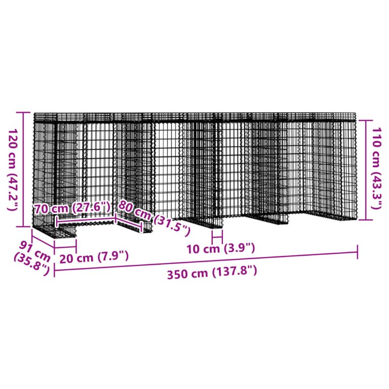 Diese Gabionen-Mülltonnenbox ist eine gute Wahl, um deine Mülltonne in deinem Garten oder auf deiner Terrasse außer Sicht zu halten. Langlebiges Material: Er ist aus korrosionsbeständigem, verzinktem Eisen gefertigt, das für Stabilität und Haltbarkeit sorgt. Aus robustem Draht mit einem Durchmesser von 3,5 mm gefertigt, stellt die Gabionenwand eine schöne Dekoration in deinem Garten zu jeder Jahreszeit dar. Stabile Konstruktion: Der Gabionenkorb besitzt eine stabile Konstruktion und lässt sich mit Steinen oder Kies füllen. Multifunktionales Design: Diese Gabione bietet nicht nur Platz für 4 Mülltonnen, sondern auch für den Anbau von Blumen und Pflanzen auf der Oberseite, um deinen Garten zu verschönern. Verstärkte Gabionenhaken: Die mitgelieferten, verstärkten Gabionenhaken verbinden die gegenüberliegenden Drahtplatten fest miteinander, sodass die Gabionenwand auch dann ihre Form behält, wenn sie mit Stein oder anderen Materialien gefüllt wird. Bequemer Gebrauch: Nach dem Zusammenbau musst du die Gabionenwand nur noch mit Steinen befüllen und schon ist sie einsatzbereit. Sie lässt sich auch mit natürlichen Materialien wie Beton, Sandstein und farbigen Steinen befüllen. Gut zu wissen:Um die Montage so einfach wie möglich zu machen, wird jedes Produkt mit einer Anleitung geliefert. Die Steine sind nicht im Lieferumfang enthalten.