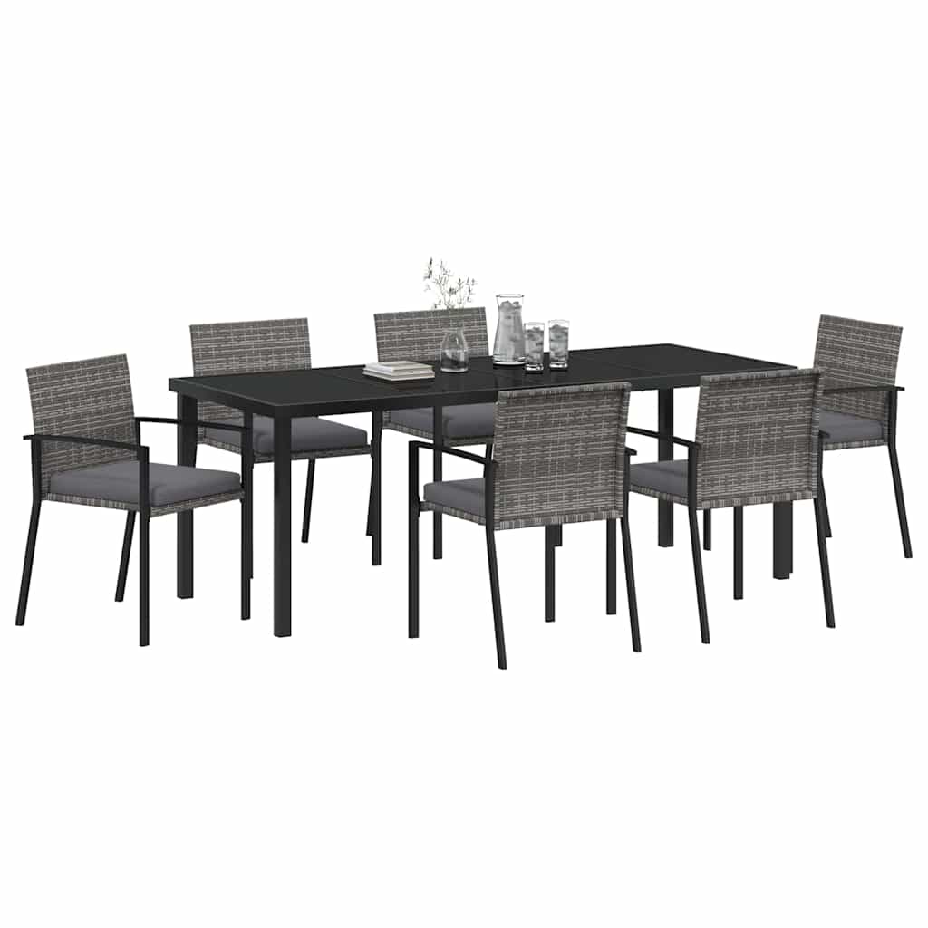 Dieses Garten-Esszimmer-Set kombiniert Stil, Funktion und Komfort. Es hat klare Linien und ein schlichtes Design, passt in jeden Garten oder auf jede Terrasse und wird zum Hingucker bei Feiern. Die schwarze Farbe gibt einen Hauch von Eleganz und ist ideal für alles von lässigen Brunches bis zu festlichen Abendessen. Materialien: Das Set verbindet eleganten pulverbeschichteten Stahl mit praktischem Poly-Rattan. Diese Materialien sind langlebig und bieten Schutz vor den Elementen. Das weiche Poly-Rattan sorgt für zusätzlichen Komfort und pflegeleichte Eigenschaften, damit du das Outdoor-Leben genießen kannst, ohne dir viele Gedanken über die Pflege machen zu müssen. Inklusive Komponenten: Das Set kommt mit bequemen Rückenlehnen und abnehmbaren Sitzkissen mit Reißverschlüssen für einfache Pflege. Die Armlehnen sorgen für mehr Komfort beim Essen im Freien. Funktionen / Design: Das moderne Design passt ideal in deine Außenbereiche. Der pulverbeschichtete Stahlrahmen hat einen minimalistischen Look und ist gleichzeitig stabil und langlebig. UV-resistente Materialien schützen das Set vor Sonnenschäden. Empfohlene Anwendung: Optimal für den Garten oder die Terrasse, spricht dieses Set Leute an, die Einfachheit und Funktionalität schätzen. Es bietet schicken und komfortablen Platz für Gäste oder gemeinsame Mahlzeiten im Freien. Pflege & Wartung: Für die Langlebigkeit nutze eine Abdeckung, wenn das Set nicht in Gebrauch ist. Regelmäßige Pflege mit einem trockenen Tuch erhält den Look, scharfe Chemikalien vermeiden. Du benötigst während der Montage einen Schraubendreher und zwei Personen, um alles richtig aufzubauen.