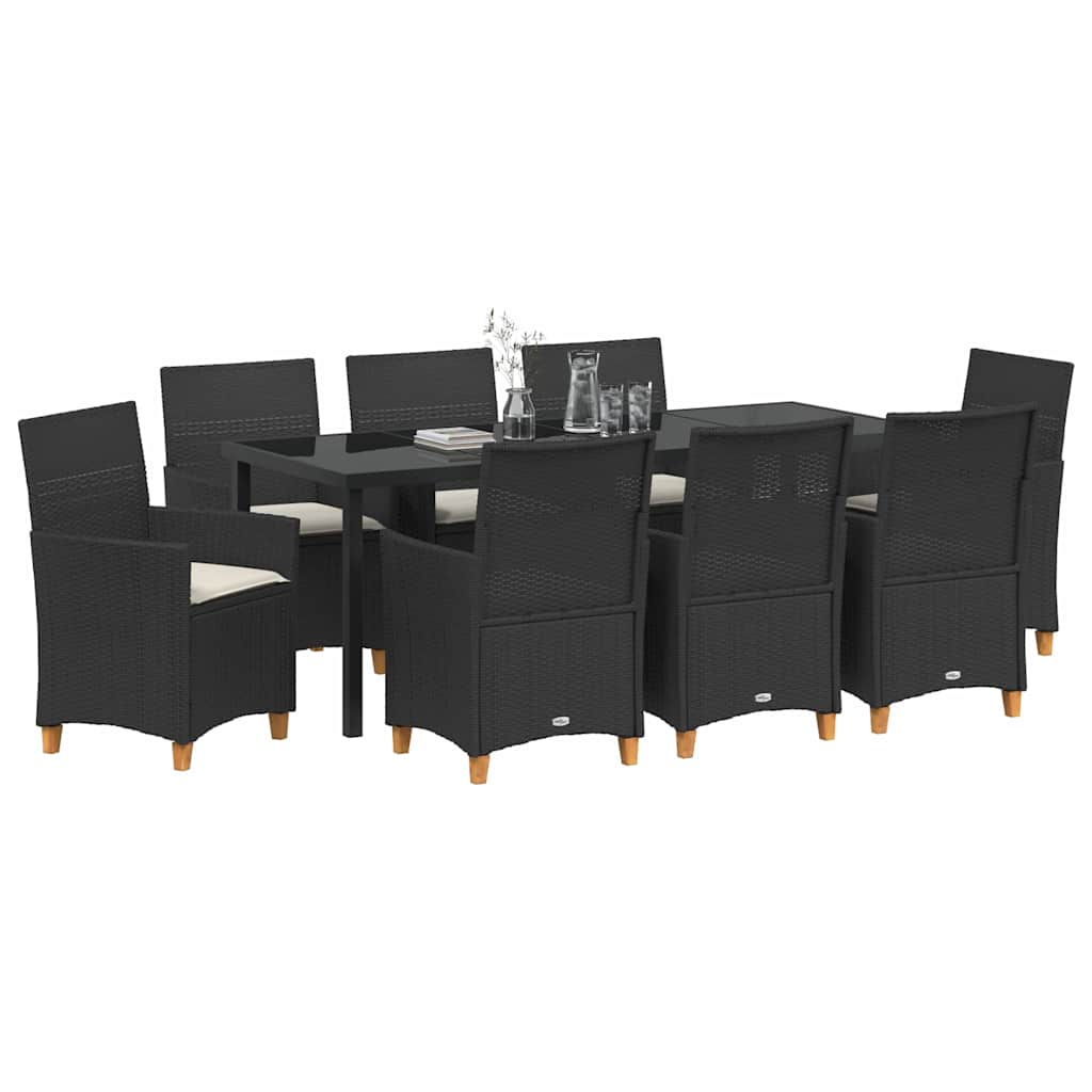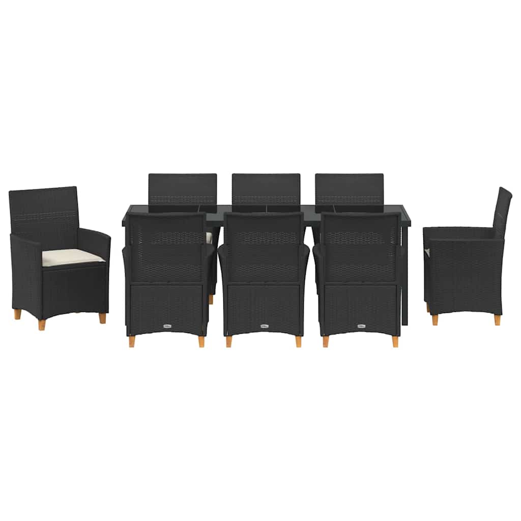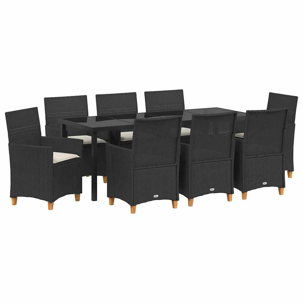 Dieses moderne Garten-Dining-Set verbindet Funktionalität und Stil. Klare Linien und minimaler Schmuck verschönern jeden Außenbereich, egal ob Garten oder Terrasse. Die schicke Optik und die langlebige Bauweise laden Familie, Freunde und Gäste ein, sich zu entspannen und unter Sonne oder Sternen zu essen oder abzuhängen. Das Set ist speziell für den Sommer ausgelegt und kombiniert ganz lässig gute Optik mit Widerstandsfähigkeit. Materialien: Das Garten-Dining-Set kombiniert schickes Poly-Rattan, Stahl und Glas. Poly-Rattan hält dem Wetter stand und ist perfekt für draußen. Der stabile Stahlrahmen sorgt für eine starke Unterstützung, und die Glasoberfläche gibt einen modernen, glatten Touch. Enthaltene Komponenten: Das Set kommt mit konischen Holzbeinen und schmalen Armlehnen, die Struktur geben und gleichzeitig bequem sind. Poly-Rattan-Kissen mit leichten Schaumpolstern bieten Flexibilität und Unterstützung für lange Nutzung. Eigenschaften / Funktion / Design: Dieses Set ist robust und hält Witterungen aus, ohne dass der Stil leidet. Die pulverbeschichtete Oberfläche sorgt für pflegeleichte Eigenschaften und braucht nur ab und zu eine Abdeckung, wenn es nicht gebraucht wird. Empfohlene Anwendungen: Perfekt für Gärten, Terrassen oder jeden Außenbereich, fügt sich das Set super in gesellige Zusammenkünfte oder ruhige Abendessen ein. Pflege & Wartung: Auch wenn die Möbel pflegeleicht sind, empfiehlt sich eine Abdeckung, wenn das Set nicht gebraucht wird, um ihr Aussehen und ihre Haltbarkeit zu verlängern. Der Pflegeaufwand ist minimal, was das Set noch attraktiver macht.