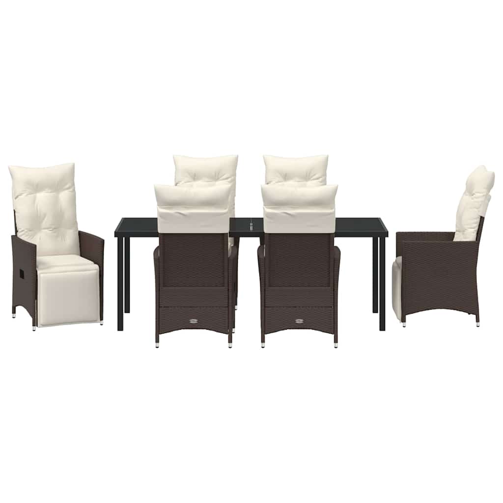 Dieses Garten-Esszimmer-Set ist die perfekte Kombination aus modernem Design und praktischem Nutzen. Es ist ideal für deine Sommerpartys auf der Terrasse oder dem Patio und punktet mit klaren Linien und wenig Schnickschnack, die den Außenbereich elegant wirken lassen. Das Set bringt frischen Wind in jeden Garten mit einem Design, das sich an moderne Außenräume anpasst. Es ist so durchdacht, dass es zu den Bedürfnissen deiner Familie passt und das Essen unter freiem Himmel noch schöner macht. Poly-Rattan-Materialien Dieses Garten-Esszimmer-Set aus hochwertigem Poly-Rattan ist UV-beständig und hält verschiedenen Wetterbedingungen stand. Es sieht auch nach längerer Nutzung gut aus und bietet ein angenehmes Outdoor-Gefühl. Komponentenübersicht Jede Teil des Sets – von den Poly-Rattan-Armlehnen bis zur Glasoberfläche – ist clever gestaltet, um dir Sitzkomfort und Essvergnügen zu bieten. Manuelle Anpassungen erhöhen die Flexibilität und die flachen Armlehnen sorgen für eine entspannte Haltung. Das macht deine Treffen sowohl stylish als auch bequem. Funktionalität und Design Dieses Esszimmer-Set deckt alle praktischen Bedürfnisse ab – ideal für Familienessen oder entspannte Kaffeepausen. Es ist leicht zu bewegen und die mehrstufigen Rückenlehnen erweitern den Komfort entsprechend deinen Vorlieben. Vielseitige Anwendungen Perfekt für Gärten, Terrassen und alle Außenbereiche, dieses Set ist das ganze Jahr über nützlich. Es eignet sich für alles, von Brunch im Sommer bis zu Abendveranstaltungen und macht jede Zusammenkunft unvergesslich. Einfache Pflege und Wartung Pass gut auf das Set auf, verwende eine Abdeckung, wenn du es nicht brauchst. Die abnehmbaren und waschbaren Kissenbezüge erleichtern die Reinigung und halten das Set immer einladend.
