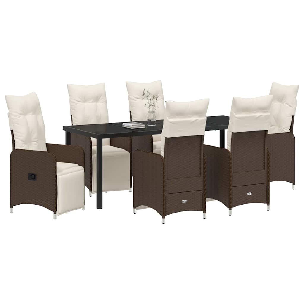 Dieses moderne Garten-Dining-Set bringt einen eleganten Akzent in deine Outdoor-Bereiche und ist perfekt für alle, die schicke und praktische Möbel mögen. Das Set ist gestaltet für zeitgenössische Umgebungen und überzeugt jeden, der klare Linien und weniger Schnickschnack schätzt. Genieße tolle Essmomente im Freien mit Familie oder Freunden, während sich das Set perfekt in Gärten oder auf Terrassen einfügt und die schöne Atmosphäre verbessert. Die Sitze laden zum Entspannen in der Natur ein, veredelt durch die elegante gehärtete Glasoberfläche, die moderne Raffinesse verkörpert. Hochwertige Materialien: Hergestellt aus Poly-Rattan, gehärtetem Glas und pulverbeschichtetem Stahl, ist dieses Dining-Set die perfekte Kombination aus Stil und Robustheit. Das Poly-Rattan hebt die moderne Ästhetik hervor und schützt vor UV-Strahlen für langanhaltende Schönheit. Der pulverbeschichtete Stahl sorgt für festen Halt und garantiert, dass das Set allen Wetterbedingungen standhält. Komplettes Set: Das Set enthält bequeme Arm- und Rückenlehnen aus Poly-Rattan, eine stilvolle gehärtete Glasoberfläche und quadratische pulverbeschichtete Stahlbeine für elegantes und stabiles Design. Es gibt auch wetterfeste Outdoorkissen mit abnehmbaren, waschbaren Bezügen für zusätzlichen Komfort. Vielseitige Nutzung: Die mehrfach verstellbare Rückenlehne kann an deine Sitzposition angepasst werden. Egal ob entspannt zurückgelehnt oder aufrecht, jede Position sorgt für optimalen Komfort und eignet sich für viele Aktivitäten, vom Essen bis zum Entspannen. Ideal für jeden Anlass: Perfekt für Garten- und Terrassenbereiche, fügt sich das Set mühelos ein und bietet einen stylishen Raum für Dinner oder entspannte Gespräche. Das elegante Design passt gut zu verschiedenen Outdoor-Dekoren. Einfache Pflege: Benutze eine Abdeckung, wenn das Set nicht genutzt wird, um es in Topform zu halten. Wische die Oberfläche regelmäßig ab, um Staubansammlungen zu vermeiden und den Glanz zu bewahren. Die abnehmbaren Kissenbezüge sind bequem zu reinigen und optimieren das Nutzungserlebnis.