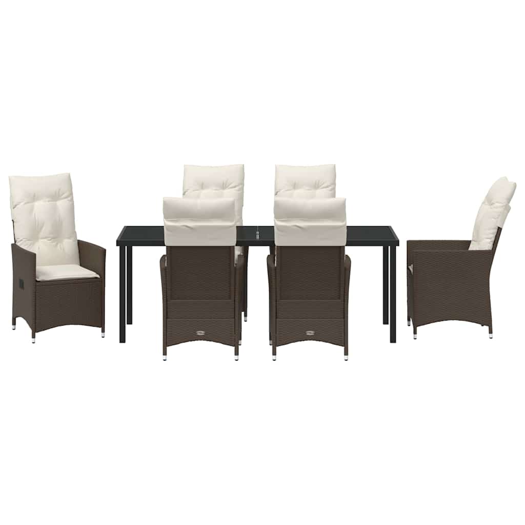 Dieses Garten-Esszimmer-Set ist die perfekte Kombination aus modernem Design und praktischem Nutzen. Es ist ideal für deine Sommerpartys auf der Terrasse oder dem Patio und punktet mit klaren Linien und wenig Schnickschnack, die den Außenbereich elegant wirken lassen. Das Set bringt frischen Wind in jeden Garten mit einem Design, das sich an moderne Außenräume anpasst. Es ist so durchdacht, dass es zu den Bedürfnissen deiner Familie passt und das Essen unter freiem Himmel noch schöner macht. Poly-Rattan-Materialien Dieses Garten-Esszimmer-Set aus hochwertigem Poly-Rattan ist UV-beständig und hält verschiedenen Wetterbedingungen stand. Es sieht auch nach längerer Nutzung gut aus und bietet ein angenehmes Outdoor-Gefühl. Komponentenübersicht Jede Teil des Sets – von den Poly-Rattan-Armlehnen bis zur Glasoberfläche – ist clever gestaltet, um dir Sitzkomfort und Essvergnügen zu bieten. Manuelle Anpassungen erhöhen die Flexibilität und die flachen Armlehnen sorgen für eine entspannte Haltung. Das macht deine Treffen sowohl stylish als auch bequem. Funktionalität und Design Dieses Esszimmer-Set deckt alle praktischen Bedürfnisse ab – ideal für Familienessen oder entspannte Kaffeepausen. Es ist leicht zu bewegen und die mehrstufigen Rückenlehnen erweitern den Komfort entsprechend deinen Vorlieben. Vielseitige Anwendungen Perfekt für Gärten, Terrassen und alle Außenbereiche, dieses Set ist das ganze Jahr über nützlich. Es eignet sich für alles, von Brunch im Sommer bis zu Abendveranstaltungen und macht jede Zusammenkunft unvergesslich. Einfache Pflege und Wartung Pass gut auf das Set auf, verwende eine Abdeckung, wenn du es nicht brauchst. Die abnehmbaren und waschbaren Kissenbezüge erleichtern die Reinigung und halten das Set immer einladend.