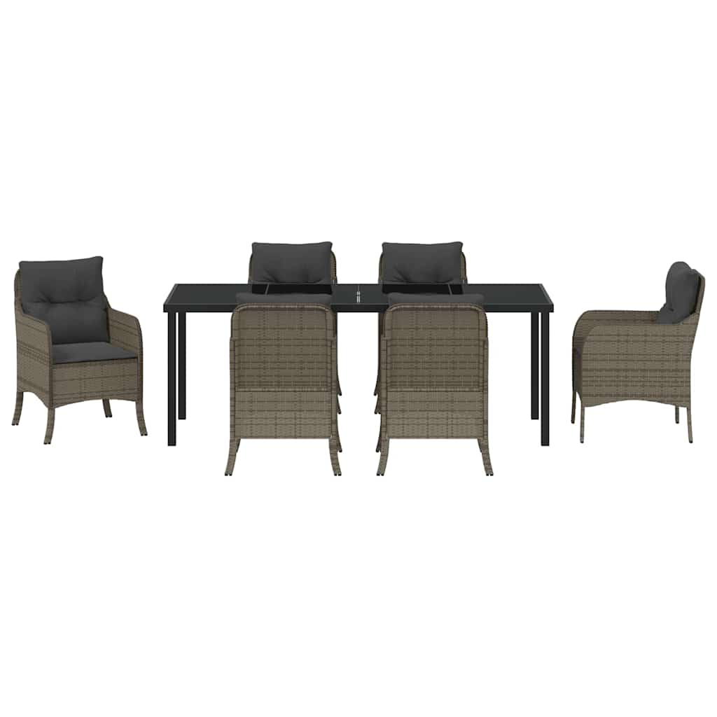 Dieses stylische Garten-Esszimmer-Set kombiniert moderne Eleganz und praktisches Design, das jeden Garten oder jede Terrasse aufwertet. Mit seinem klaren Look ist es perfekt für verschiedene Anlässe, von kleinen Treffen bis zu großen Feiern. Es schafft einen einladenden Bereich, wo Familie und Freunde unvergessliche Momente draußen genießen können. Stylisches modernes Design Das schlichte Design bringt eine unauffällige Eleganz und wertet jeden Außenbereich auf. Die klaren Linien sorgen dafür, dass das Set perfekt in moderne Umgebungen passt und bei deinen Sommerveranstaltungen zum Gesprächsthema wird. Langlebig bei jedem Wetter Hergestellt aus UV-beständigem Poly-Rattan und pulverbeschichtetem Stahl, hält dieses Set auch dem Sommerwetter stand. Die Materialien sorgen dafür, dass alles schön aussieht und gut funktioniert, egal wie oft es im Garten genutzt wird. Bequem und praktisch Alle Stühle kommen mit bequemen Outdoor-Kissen, die lange Sitzungen ermöglichen. Die Kissenbezüge sind abnehmbar und waschbar, sodass Pflege und Frische einfach sind, auch bei häufigem Gebrauch. Funktionaler Essbereich Der Tisch mit Sicherheitsglas bringt nicht nur Stil, sondern ist auch einfach zu reinigen. Die flachen Armlehnen und die Rückenlehne sorgen für komfortables Sitzen. Praktische Pflegehinweise Um das Set schön zu halten, ist es ratsam, eine Abdeckung zu verwenden, wenn es nicht gebraucht wird. Das verlängert die Lebensdauer und sorgt dafür, dass es immer bereit für gesellige Zusammenkünfte ist.