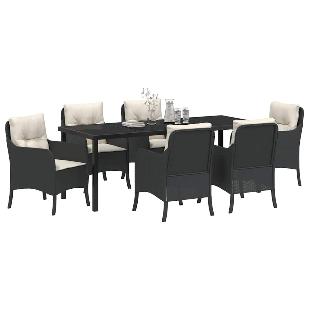 Dieses stylische Garten-Esszimmer-Set kombiniert moderne Eleganz und praktisches Design, das jeden Garten oder jede Terrasse aufwertet. Mit seinem klaren Look ist es perfekt für verschiedene Anlässe, von kleinen Treffen bis zu großen Feiern. Es schafft einen einladenden Bereich, wo Familie und Freunde unvergessliche Momente draußen genießen können. Stylisches modernes Design Das schlichte Design bringt eine unauffällige Eleganz und wertet jeden Außenbereich auf. Die klaren Linien sorgen dafür, dass das Set perfekt in moderne Umgebungen passt und bei deinen Sommerveranstaltungen zum Gesprächsthema wird. Langlebig bei jedem Wetter Hergestellt aus UV-beständigem Poly-Rattan und pulverbeschichtetem Stahl, hält dieses Set auch dem Sommerwetter stand. Die Materialien sorgen dafür, dass alles schön aussieht und gut funktioniert, egal wie oft es im Garten genutzt wird. Bequem und praktisch Alle Stühle kommen mit bequemen Outdoor-Kissen, die lange Sitzungen ermöglichen. Die Kissenbezüge sind abnehmbar und waschbar, sodass Pflege und Frische einfach sind, auch bei häufigem Gebrauch. Funktionaler Essbereich Der Tisch mit Sicherheitsglas bringt nicht nur Stil, sondern ist auch einfach zu reinigen. Die flachen Armlehnen und die Rückenlehne sorgen für komfortables Sitzen. Praktische Pflegehinweise Um das Set schön zu halten, ist es ratsam, eine Abdeckung zu verwenden, wenn es nicht gebraucht wird. Das verlängert die Lebensdauer und sorgt dafür, dass es immer bereit für gesellige Zusammenkünfte ist.
