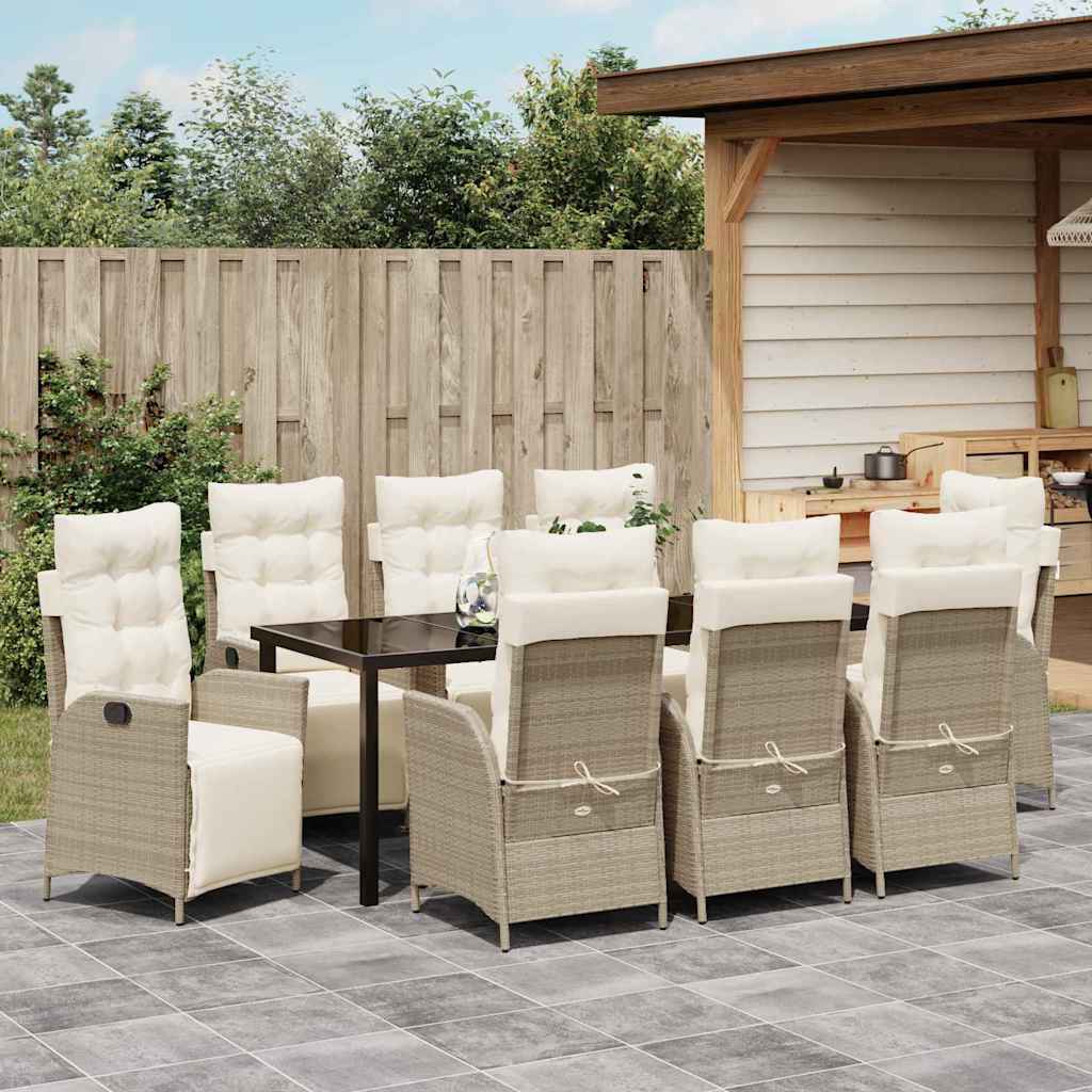 Dieses verstellbare Garten-Dining-Set bringt moderne Schlichtheit und Funktionalität mit cleanen Linien und wenig Schnickschnack. Es ist ideal fürs Essen im Freien in deinem Garten oder auf der Terrasse und bietet Stil und Komfort für deine Sommer-Treffen. Die rechteckige Form und das zeitgemäße Design ergänzen jede Outdoor-Deko und laden zu netten Mahlzeiten und entspannten Gesprächen in der Natur ein. Jedes Detail ist so gestaltet, dass es sich nahtlos in die Umgebung einfügt, während die praktischen, verstellbaren Funktionen dein Erlebnis verbessern. Poly-Rattan und Stahlkonstruktion: Das Dining-Set besteht aus Poly-Rattan und pulverbeschichtetem Stahl, sorgt für Wetterbeständigkeit und ein modernes Aussehen. Der Poly-Rattan sorgt für visuelle Anziehung und stabilisiert das Set. Verstellbarkeit: Mit einem Griff, um die Fußstützen auf verschiedene Höhen einzustellen, kann jeder seinen Platz bequem anpassen. Ideal zum Entspannen im Garten, verleiht diese Funktion dem Set eine vielseitige Note. Einbeziehung von Komponenten: Das Set hat gepolsterte Sitzkissen aus weichem Polyester für zusätzlichen Komfort. Die Tischplatte aus gehärtetem Glas ist pflegeleicht und sieht schick aus. Praktische Verwendung: Perfekt für Terrassen, Gärten und Patios. Ob beim Sommeressen oder einem ruhigen Nachmittagstee, es passt sich jeder Gelegenheit an. Pflege & Wartung: Einfache Pflege, indem du eine Schutzhülle verwendest, wenn es nicht gebraucht wird. So bleibt das Set über längere Zeit in einwandfreiem Zustand und erhöht die Langlebigkeit.