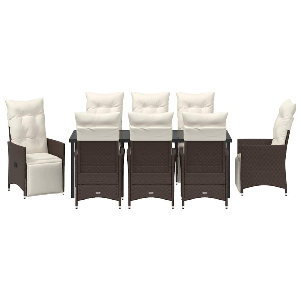 Dieses Garten-Esszimmer-Set ist die perfekte Kombination aus modernem Design und praktischem Nutzen. Es ist ideal für deine Sommerpartys auf der Terrasse oder dem Patio und punktet mit klaren Linien und wenig Schnickschnack, die den Außenbereich elegant wirken lassen. Das Set bringt frischen Wind in jeden Garten mit einem Design, das sich an moderne Außenräume anpasst. Es ist so durchdacht, dass es zu den Bedürfnissen deiner Familie passt und das Essen unter freiem Himmel noch schöner macht. Poly-Rattan-Materialien Dieses Garten-Esszimmer-Set aus hochwertigem Poly-Rattan ist UV-beständig und hält verschiedenen Wetterbedingungen stand. Es sieht auch nach längerer Nutzung gut aus und bietet ein angenehmes Outdoor-Gefühl. Komponentenübersicht Jede Teil des Sets – von den Poly-Rattan-Armlehnen bis zur Glasoberfläche – ist clever gestaltet, um dir Sitzkomfort und Essvergnügen zu bieten. Manuelle Anpassungen erhöhen die Flexibilität und die flachen Armlehnen sorgen für eine entspannte Haltung. Das macht deine Treffen sowohl stylish als auch bequem. Funktionalität und Design Dieses Esszimmer-Set deckt alle praktischen Bedürfnisse ab – ideal für Familienessen oder entspannte Kaffeepausen. Es ist leicht zu bewegen und die mehrstufigen Rückenlehnen erweitern den Komfort entsprechend deinen Vorlieben. Vielseitige Anwendungen Perfekt für Gärten, Terrassen und alle Außenbereiche, dieses Set ist das ganze Jahr über nützlich. Es eignet sich für alles, von Brunch im Sommer bis zu Abendveranstaltungen und macht jede Zusammenkunft unvergesslich. Einfache Pflege und Wartung Pass gut auf das Set auf, verwende eine Abdeckung, wenn du es nicht brauchst. Die abnehmbaren und waschbaren Kissenbezüge erleichtern die Reinigung und halten das Set immer einladend.