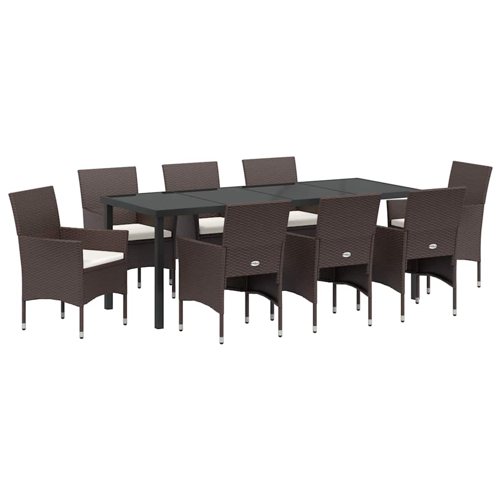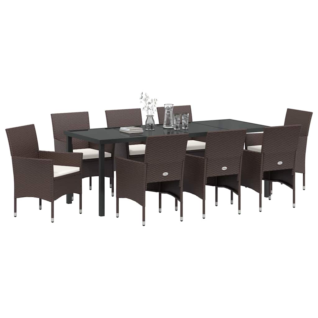 Dieses moderne Gartendining-Set strahlt Eleganz und Vielseitigkeit aus – ideal für alle, die gerne draußen feiern oder entspannen. Mit klaren Linien und minimalistischem Design passt es perfekt in jeden Garten oder auf jede Terrasse und schafft einen einladenden Ort, um die Natur zu genießen. Pulverbeschichteter Stahlrahmen: Ein robuster Rahmen sorgt dafür, dass dieses Set allen Wetterlagen standhält und sorgt für stabilen Gebrauch. Die pulverbeschichtete Oberfläche sieht klasse aus und macht das Set zum perfekten Begleiter im Freien, das ganzjährig genutzt werden kann. Poly-Rattan Rücken und Armlehnen: Die Kombination aus Poly-Rattan für die Rückenlehne und Armlehnen bringt Stil und Komfort mit ergonomischer Unterstützung. Dieses Material ist UV-beständig und bleibt somit auch bei direkter Sonneneinstrahlung, immer ansprechend. Gehärtete Glas Tischoberfläche: Eine schicke gehärtete Glasplatte sorgt für eine einfache Pflege und hält auch intensiven Anwendungsbedingungen stand. Das Glasdesign passt super in ein modernes Außenambiente und bleibt funktional und stilvoll. Wetterfeste Kissen: Die Kissen sind unter verschiedenen Wetterbedingungen ein komfortabler Hit. Hochwertiger Stoff sorgt dafür, dass sie lange halten. Die Schaumfüllung macht das Sitzen auch nach längerem Gebrauch angenehm und ist perfekt für entspannte Sommerabende. Sommerbereit: Dieses Set ist so konzipiert, dass es jede Terrasse oder jeden Garten aufwertet. Es lässt sich leicht montieren und benötigt nur zwei Personen und einen Schraubendreher – perfekt, um deinen Außenbereich mühelos zu optimieren.