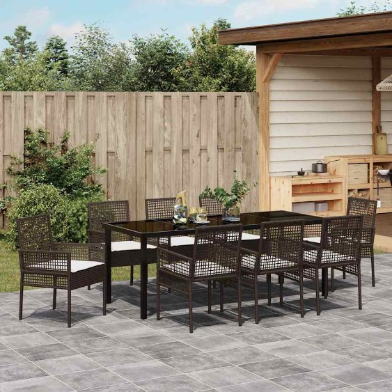 Dieses Garten-Dining-Set bringt moderne Eleganz direkt in deinen Garten oder auf deine Terrasse. Perfekt für unvergessliche Sommerfeste mit Familie und Freunden – das schlanke Design fügt sich nahtlos in jeden Garten oder jede Terrasse ein und macht es zu einer praktischen und stylischen Ergänzung für deinen Außenbereich. Die Kombination aus minimalistischem Design und hochwertigen Materialien schafft eine einladende Atmosphäre für das Essen im Freien – ideal, um zu entspannen oder eine ruhige Mahlzeit im Freien zu genießen. Das Set verbindet Komfort mit Praktikabilität und sieht dabei auch noch ansprechend aus, sodass jedes Erlebnis im Freien zum Genuss wird. Hochwertiges Poly-Rattan: Dieses Garten-Dining-Set aus hochwertigem Poly-Rattan überzeugt mit bester UV-Beständigkeit und Langlebigkeit, auch bei viel Sonnenlicht. Die gewebte Textur sorgt für Komfort und ist so gestaltet, dass das Set auch über die Jahreszeiten hinweg seinen eleganten Look behält. Komplett Set: Dieses durchdachte Set besteht aus einem robusten, pulverbeschichteten Stahlrahmen, der für Stabilität sorgt. Dank Poly-Rattan-Armlehnen und einer entspiegelten Glasplatte hast du eine stilvolle und praktische Oberfläche zum Essen. Die abnehmbaren Schaumstoffkissen garantieren längeren Sitzkomfort. Moderne Eigenschaften: Mit quadratischen Beinen und flachen Armlehnen bringt das Set modernen Stil mit einem klaren Look in deinen Außenbereich. Leicht und dennoch stabil, lässt es sich einfach umstellen. Vielseitige Nutzung im Freien: Ideal für Sommertage auf der Terrasse oder Gartenfeiern, macht das Set jeden Außenbereich attraktiver. Perfekt für gesellige Events, bietet dieses Ensemble Komfort und Eleganz für verschiedene Anlässe. Einfach zu pflegen: Wische die entspiegelte Glasplatte einfach mit einem trockenen Tuch ab, um das makellose Aussehen zu erhalten. Bei schlechtem Wetter empfehlen wir, eine Abdeckung für Gartenmöbel zu verwenden, um die Langlebigkeit das ganze Jahr über zu gewährleisten.