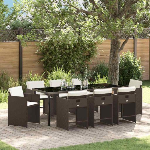 Dieses moderne Garten-Esszimmer-Set ist der Inbegriff von stylischem Sitzen im Freien. Perfekt für gesellige Sommermomente auf jeder Terrasse oder in jedem Garten. Mit seinem schlanken Look aus hochwertigen Materialien bietet es eine coole und praktische Option für moderne Häuser, die Funktionalität und gutes Aussehen vereint. Das Set enthält einen großen Tisch und bequeme Stühle, die einfach dazu einladen, unter freiem Himmel mit Freunden und Familie zu essen. UV-beständiges Poly-Rattan: Poly-Rattan ist super widerstandsfähig gegen die heiße Sommersonne und behält seine Farbe und Textur über viele Saisons. Das Geflecht sorgt für eine schicke, ansprechende Oberfläche, die deinem Außenbereich einen modernen, minimalistischen Look gibt. Pulverbeschichteter Stahlrahmen: Jeder Teil, von Rahmen bis Stuhlbeinen, ist aus pulverbeschichtetem Stahl gefertigt, was optimalen Schutz vor Witterungseinflüssen bietet. So sieht das noch schicker aus, und die Möbel halten viele Jahre. Temperierte Glasoberfläche: Die Glas-Tischplatte sieht nicht nur gut aus, sondern ist auch robust und kratzfest. So bleibt das Essen eine Freude, und die Pflege ist ganz einfach. Komfort mit Stil: Die bequemen Kissen sind für entspannende Nachmittage und gesellige Abende gedacht. Sie sind wetterfest und geben dem stabilen Gestell eine angenehme Weichheit. Durchdachtes Design: Ganz gleich, ob du ein ruhiges Abendessen oder eine lebhafte Feier planst, dieses Set passt sich jeder Gelegenheit an. Die flachen Armlehnen bieten Komfort, und die stabilen Beine sorgen dafür, dass alles sicher steht. Das flexible Design macht es zu einer super Ergänzung deiner Gartenmöbel.
