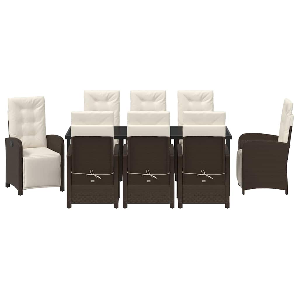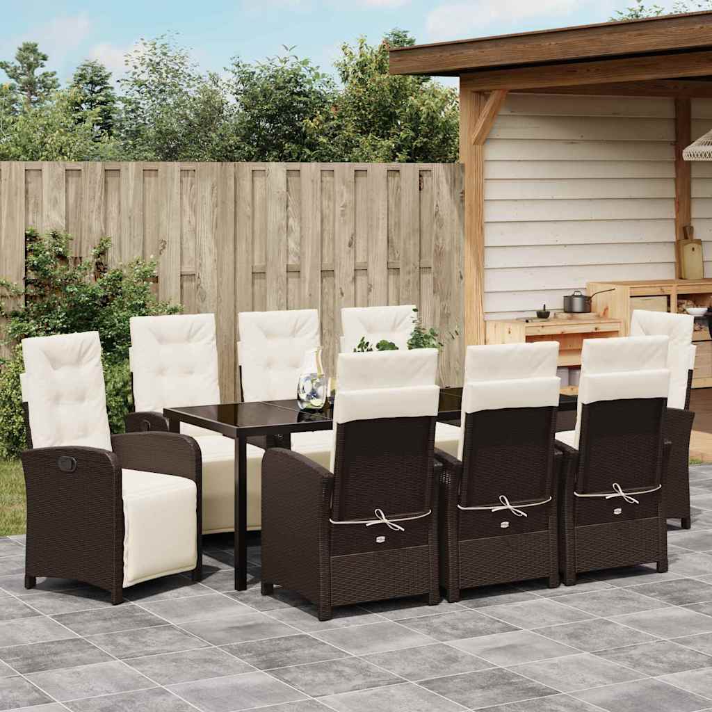 Dieses moderne Garten-Dining-Set verwandelt jeden Außenbereich in einen stylischen Essplatz, der Einfachheit und Funktionalität vereint. Ideal für sommerliche Feiern, zeigt der Poly-Rattan-Rahmen mit der Glasoberfläche einen modernen Charme und schafft einen einladenden Platz für geselliges Beisammensein mit Familie und Freunden. Es ist der Mittelpunkt für gemütliche Mahlzeiten sowie lebhafte Events und fügt sich nahtlos in die Gartenaesthetik ein, während es den Übergang vom Innen- ins Außenleben erleichtert. Haltbare Materialien: Das Set ist aus wetterbeständigem Poly-Rattan gefertigt, das immer gut aussieht. Der Stahlrahmen sorgt dafür, dass alles stabil bleibt und viel aushält, ob im Alltag oder bei besonderen Anlässen. Funktionale Komponenten: Inklusive einer polierten, gehärteten Glasoberfläche – schick und leicht zu reinigen. Die manuell verstellbaren Rückenlehnen bieten verschiedene Liegepositionen für den Komfort deiner Gäste. Ergonomische Merkmale: Mit Schienen-Armlagen und dünnen Sitzpolstern für bequemen Sitz. Es bietet einen tollen Stil, ohne überladen zu wirken. Das Pfosten-Bein-Design sorgt für Stabilität und Sicherheit während der Nutzung. Vielseitige Nutzungsmöglichkeiten: Super geeignet für Gärten oder Terrassen, ideal für entspannten Brunch in der Sonne oder für romantische Abendessen unter dem Sternenhimmel. Passt gut in städtische und vorstädtische Umgebungen. Pflegehinweise: Halte dein Dining-Set in Top-Zustand mit einer wetterfesten Abdeckung, wenn es nicht verwendet wird. Der Aufbau erfordert zwei Personen und einen Schraubendreher – so sorgt es für stabile Nutzung in verschiedenen Außenbereichen.