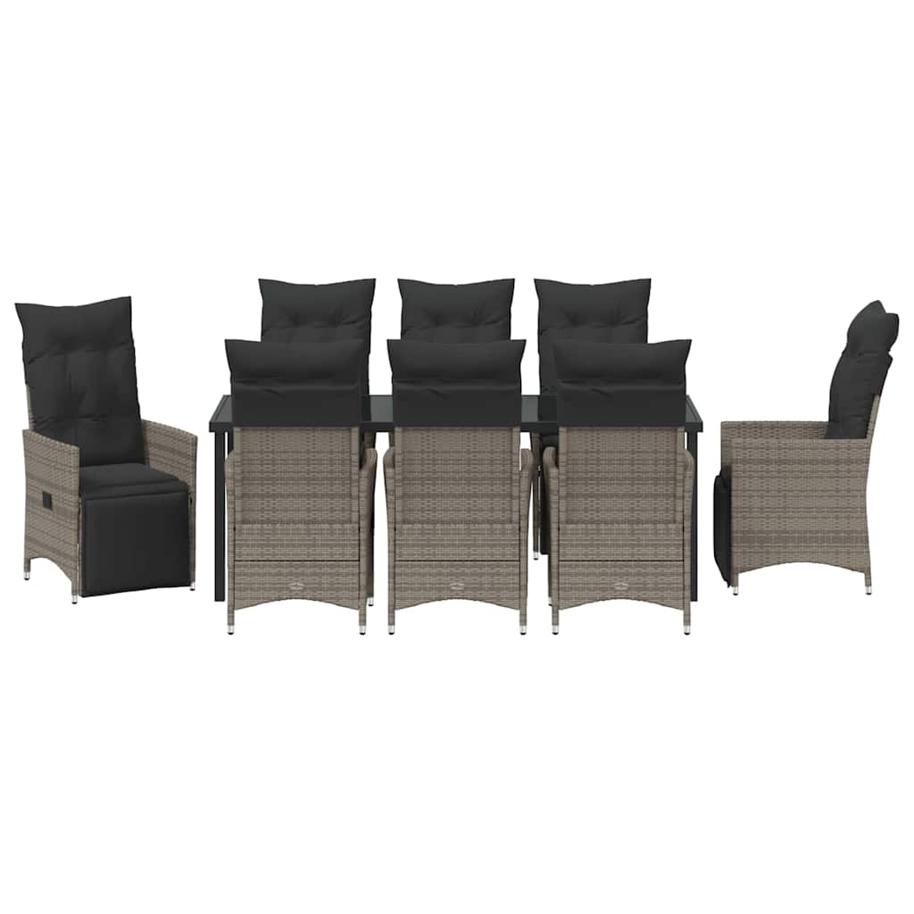 Dieses Garten-Esszimmer-Set ist die perfekte Kombination aus modernem Design und praktischem Nutzen. Es ist ideal für deine Sommerpartys auf der Terrasse oder dem Patio und punktet mit klaren Linien und wenig Schnickschnack, die den Außenbereich elegant wirken lassen. Das Set bringt frischen Wind in jeden Garten mit einem Design, das sich an moderne Außenräume anpasst. Es ist so durchdacht, dass es zu den Bedürfnissen deiner Familie passt und das Essen unter freiem Himmel noch schöner macht. Poly-Rattan-Materialien Dieses Garten-Esszimmer-Set aus hochwertigem Poly-Rattan ist UV-beständig und hält verschiedenen Wetterbedingungen stand. Es sieht auch nach längerer Nutzung gut aus und bietet ein angenehmes Outdoor-Gefühl. Komponentenübersicht Jede Teil des Sets – von den Poly-Rattan-Armlehnen bis zur Glasoberfläche – ist clever gestaltet, um dir Sitzkomfort und Essvergnügen zu bieten. Manuelle Anpassungen erhöhen die Flexibilität und die flachen Armlehnen sorgen für eine entspannte Haltung. Das macht deine Treffen sowohl stylish als auch bequem. Funktionalität und Design Dieses Esszimmer-Set deckt alle praktischen Bedürfnisse ab – ideal für Familienessen oder entspannte Kaffeepausen. Es ist leicht zu bewegen und die mehrstufigen Rückenlehnen erweitern den Komfort entsprechend deinen Vorlieben. Vielseitige Anwendungen Perfekt für Gärten, Terrassen und alle Außenbereiche, dieses Set ist das ganze Jahr über nützlich. Es eignet sich für alles, von Brunch im Sommer bis zu Abendveranstaltungen und macht jede Zusammenkunft unvergesslich. Einfache Pflege und Wartung Pass gut auf das Set auf, verwende eine Abdeckung, wenn du es nicht brauchst. Die abnehmbaren und waschbaren Kissenbezüge erleichtern die Reinigung und halten das Set immer einladend.