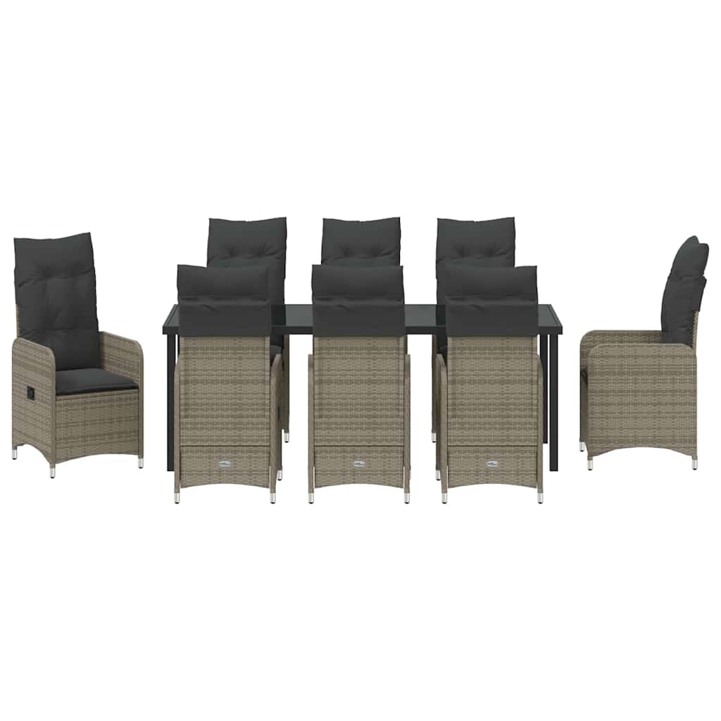 Dieses moderne Garten-Dining-Set bringt einen eleganten Akzent in deine Outdoor-Bereiche und ist perfekt für alle, die schicke und praktische Möbel mögen. Das Set ist gestaltet für zeitgenössische Umgebungen und überzeugt jeden, der klare Linien und weniger Schnickschnack schätzt. Genieße tolle Essmomente im Freien mit Familie oder Freunden, während sich das Set perfekt in Gärten oder auf Terrassen einfügt und die schöne Atmosphäre verbessert. Die Sitze laden zum Entspannen in der Natur ein, veredelt durch die elegante gehärtete Glasoberfläche, die moderne Raffinesse verkörpert. Hochwertige Materialien: Hergestellt aus Poly-Rattan, gehärtetem Glas und pulverbeschichtetem Stahl, ist dieses Dining-Set die perfekte Kombination aus Stil und Robustheit. Das Poly-Rattan hebt die moderne Ästhetik hervor und schützt vor UV-Strahlen für langanhaltende Schönheit. Der pulverbeschichtete Stahl sorgt für festen Halt und garantiert, dass das Set allen Wetterbedingungen standhält. Komplettes Set: Das Set enthält bequeme Arm- und Rückenlehnen aus Poly-Rattan, eine stilvolle gehärtete Glasoberfläche und quadratische pulverbeschichtete Stahlbeine für elegantes und stabiles Design. Es gibt auch wetterfeste Outdoorkissen mit abnehmbaren, waschbaren Bezügen für zusätzlichen Komfort. Vielseitige Nutzung: Die mehrfach verstellbare Rückenlehne kann an deine Sitzposition angepasst werden. Egal ob entspannt zurückgelehnt oder aufrecht, jede Position sorgt für optimalen Komfort und eignet sich für viele Aktivitäten, vom Essen bis zum Entspannen. Ideal für jeden Anlass: Perfekt für Garten- und Terrassenbereiche, fügt sich das Set mühelos ein und bietet einen stylishen Raum für Dinner oder entspannte Gespräche. Das elegante Design passt gut zu verschiedenen Outdoor-Dekoren. Einfache Pflege: Benutze eine Abdeckung, wenn das Set nicht genutzt wird, um es in Topform zu halten. Wische die Oberfläche regelmäßig ab, um Staubansammlungen zu vermeiden und den Glanz zu bewahren. Die abnehmbaren Kissenbezüge sind bequem zu reinigen und optimieren das Nutzungserlebnis.