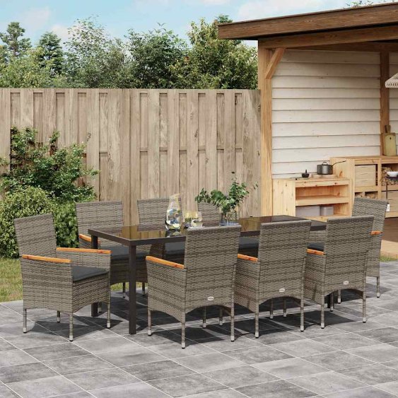 Dieses moderne Garten-Esstischset ist eine klasse Ergänzung für deinen Außenbereich und bringt den perfekten Mix aus Stil und Funktion. Mit klaren Linien, schlichten Details und einer tollen Materialkombination hat es einen zeitgemäßen Look, der jeden Garten oder jede Terrasse aufpeppt. Das Set hat einen Esstisch mit Glasoberfläche und bequemen Sitzplätzen aus Poly-Rattan mit Kissen. Super für sommerliche Treffen oder entspannte Nachmittage, verwandelt dieses Set das Essen im Freien. Hochwertige Materialien Dieses Esszimmer-Set ist aus UV-beständigem und wetterfestem Poly-Rattan, was für eine lange Haltbarkeit sorgt, selbst unter harten Sommerbedingungen. Der pulverbeschichtete Stahlrahmen garantiert Stabilität und Stärke. Komplette Komponenten Das Set bietet Poly-Rattan Rückenlehnen, die ergonomisch geformt sind, flache Akazienholzarmlehnen für einen Hauch von Eleganz und eine gebogene Glas-Oberfläche für einfache Reinigung. Die Außenkissen erhöhen den Sitzkomfort und sind für verschiedene Wetterbedingungen geeignet. Funktionale Merkmale Durch ein praktisches Design mit abnehmbaren Kissenbezügen, die waschbar sind, wird die Pflege zum Kinderspiel und das Set passt sich unterschiedlichen Nutzerbedürfnissen an. Die leichte Bauweise macht es einfach, für verschiedene Anlässe umzustellen, ohne an Stabilität einzubüßen. Vielseitige Nutzung Ideal für Garten- und Terrassenumgebungen, dieses Set ist perfekt für viele Freizeitaktivitäten, von Familienessen bis hin zu Feiern, und bietet mit seinem modernen Design einen komfortablen und stilvollen Rahmen. Pflegehinweise Es wird empfohlen, eine Abdeckung zu benutzen, um die Möbel bei Nichtgebrauch zu schützen und ihre Langlebigkeit zu fördern. Eine einfache Reinigung mit einem Tuch hilft, das strahlende Finish über die Zeit zu erhalten.