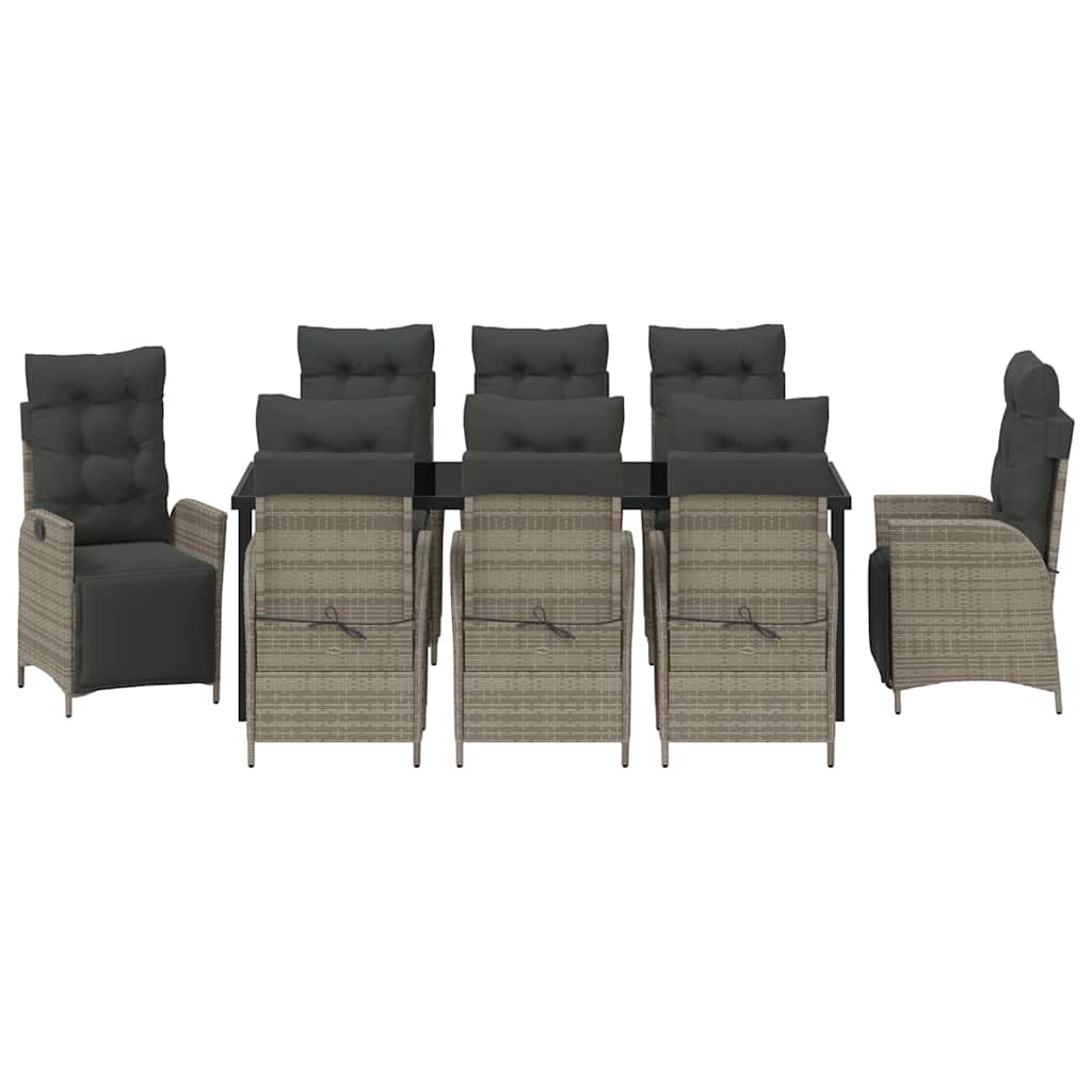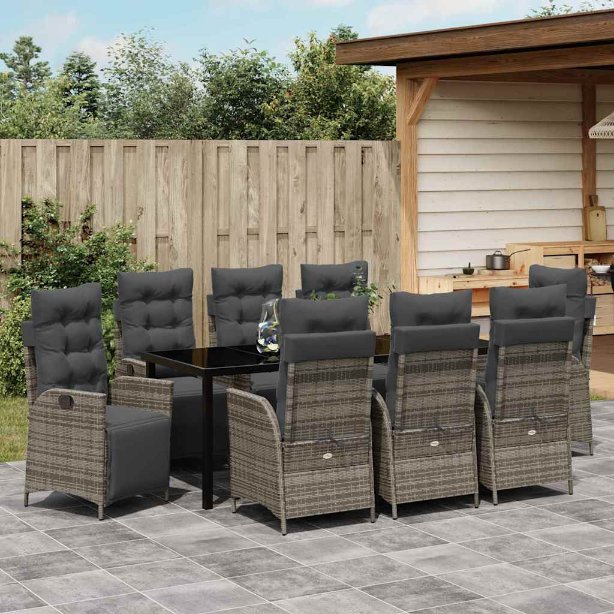 Dieses verstellbare Garten-Dining-Set bringt moderne Schlichtheit und Funktionalität mit cleanen Linien und wenig Schnickschnack. Es ist ideal fürs Essen im Freien in deinem Garten oder auf der Terrasse und bietet Stil und Komfort für deine Sommer-Treffen. Die rechteckige Form und das zeitgemäße Design ergänzen jede Outdoor-Deko und laden zu netten Mahlzeiten und entspannten Gesprächen in der Natur ein. Jedes Detail ist so gestaltet, dass es sich nahtlos in die Umgebung einfügt, während die praktischen, verstellbaren Funktionen dein Erlebnis verbessern. Poly-Rattan und Stahlkonstruktion: Das Dining-Set besteht aus Poly-Rattan und pulverbeschichtetem Stahl, sorgt für Wetterbeständigkeit und ein modernes Aussehen. Der Poly-Rattan sorgt für visuelle Anziehung und stabilisiert das Set. Verstellbarkeit: Mit einem Griff, um die Fußstützen auf verschiedene Höhen einzustellen, kann jeder seinen Platz bequem anpassen. Ideal zum Entspannen im Garten, verleiht diese Funktion dem Set eine vielseitige Note. Einbeziehung von Komponenten: Das Set hat gepolsterte Sitzkissen aus weichem Polyester für zusätzlichen Komfort. Die Tischplatte aus gehärtetem Glas ist pflegeleicht und sieht schick aus. Praktische Verwendung: Perfekt für Terrassen, Gärten und Patios. Ob beim Sommeressen oder einem ruhigen Nachmittagstee, es passt sich jeder Gelegenheit an. Pflege & Wartung: Einfache Pflege, indem du eine Schutzhülle verwendest, wenn es nicht gebraucht wird. So bleibt das Set über längere Zeit in einwandfreiem Zustand und erhöht die Langlebigkeit.