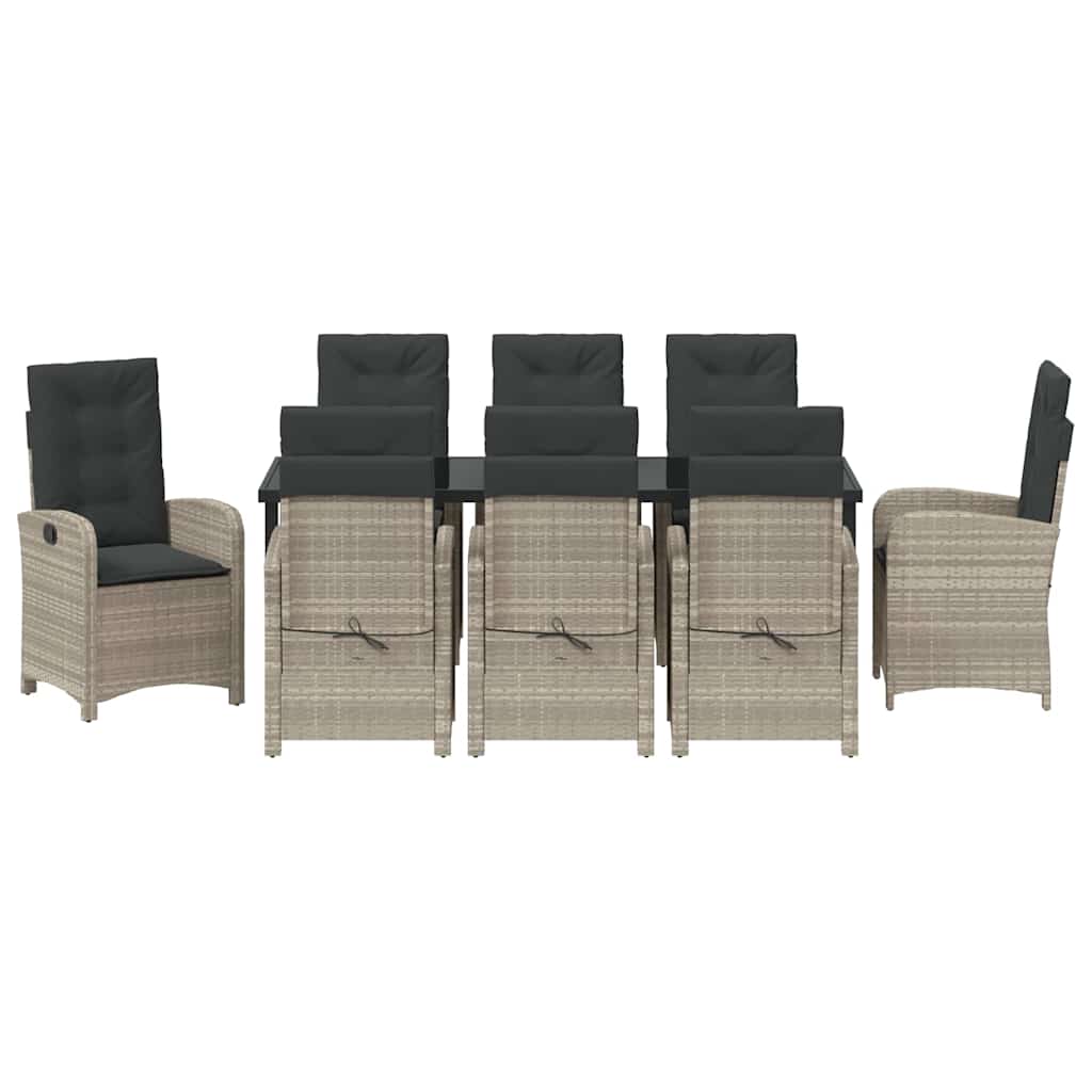 Dieses moderne Garten-Diningset vereint Einfachheit und Funktionalität und ist die perfekte Wahl für Terrassen und Gärten im Freien. Es wurde so designt, dass es sowohl stilvoll als auch langlebig ist. Die klaren Linien und minimalen Verzierungen passen in jede moderne Umgebung. Das Set kommt mit bequemen Kissen und einem stabilen Rahmen, damit du entspannte Nachmittage genießen oder tolle Zusammenkünfte mit Leichtigkeit ausrichten kannst – die perfekte Verbindung von zeitgenössischem Design und Praktikabilität für jeden Außenbereich. Langlebige Bauweise: Dieses Set ist aus Poly-Rattan und hat Stahlbeine, die eine stabile Grundlage bieten und damit super langlebig sind. Die wetterbeständigen Materialien schützen dein Diningset vor Wind und Wetter, sodass es immer in Top-Zustand bleibt. Ergonomischer Komfort: Die mehrstufige Rückenlehne ist ideal, um den perfekten Winkel zum Entspannen zu finden. Die schmalen Armlehnen bieten zusätzlichen Halt, während das Sitzpolster leichten Komfort bringt – perfekt für jeden Moment im Freien. Funktionale Komponenten: Das Set hat eine elegante, moderne Glasoberfläche, die nicht nur schön aussieht, sondern auch ganz leicht zu reinigen ist. Die glatte Tischoberfläche sorgt für zusätzliches Eye-Candy und macht es perfekt für stylisches Dinieren oder gesellige Zusammenkünfte. Minimalistisches Design: Das moderne Design jedes Stücks wird durch schöne Rückseiten ergänzt, die sich toll in das klare Design einfügen. So passt es super in intime Settings und große Anlässe – es fügt sich nahtlos in verschiedene Außenumgebungen ein. Pflege & Wartung: Wenn du dein Garten-Diningset nicht benutzt, schütze es am besten mit einer geeigneten Abdeckung. So verhinderst du Schäden durch schlechtes Wetter und sorgst dafür, dass die Möbel länger gut aussehen.