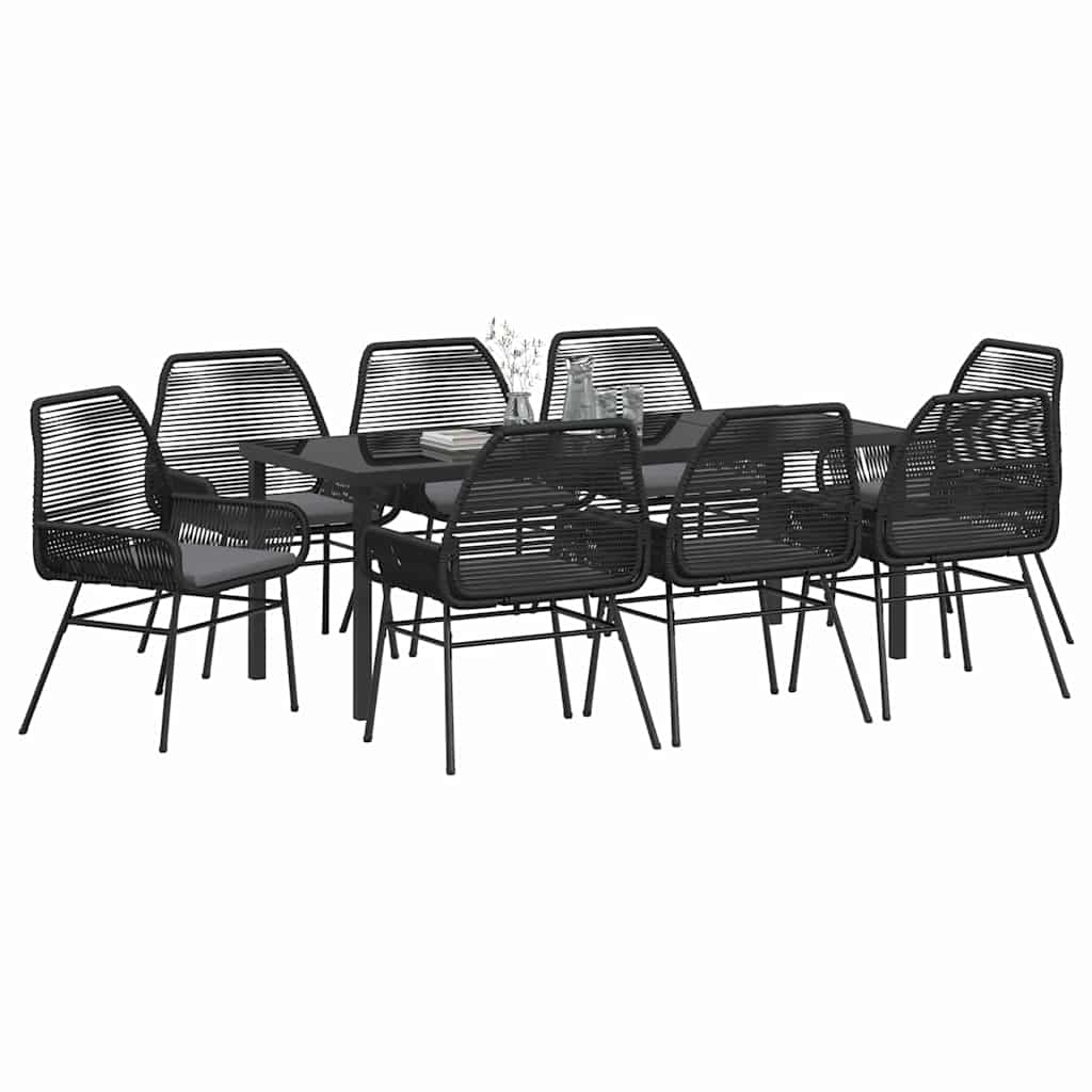 Dieses Poly Rattan Garten Esszimmer Set ist die perfekte Ergänzung für jeden Garten oder Terrasse, für alle, die Stil und Funktion schätzen. Das moderne Design ist geprägt von schlanken Linien und minimalistischem Look, sodass es sich nahtlos in verschiedene Außenumgebungen einfügt. Ideal, um Gäste im Sommer zu unterhalten, verbindet sein zeitgenössisches Erscheinungsbild Schönheit mit entspannten Abenden im Freien, beim Essen mit Freunden oder Familienfeiern. Das saubere Design und der praktische Stil machen es vielseitig für verschiedenste Outdoor-Einstellungen und bieten den nötigen Komfort. Poly Rattan Außenmaterial: Das Garten-Esszimmer Set hat ein robustes Poly-Rattan-Außenmaterial, das durch seine Langlebigkeit ideal für draußen geeignet ist. Es sorgt für ein ansprechendes Design und garantiert gleichzeitig, dass es über die Zeit hinweg gut aussieht und stabil bleibt. Pulverbeschichteter Stahlrahmen: Der pulverbeschichtete Stahlrahmen sorgt für Stabilität und Stärke. Dieser robuste Rahmen schützt gegen verschiedene Wetterbedingungen und erhöht die Langlebigkeit des Esszimmer Sets. Praktische Sitzpolster: Die Sitzpolster aus Polyesterfüllung bieten ein komfortables Sitzerlebnis. Diese wertvolle Ergänzung sorgt dafür, dass Gäste ihre Mahlzeiten oder Gespräche gemütlich am Tisch genießen können. Schwarze, temperierte Glasoberfläche: Die schwarze, gehärtete Glasoberfläche verleiht dem Tisch nicht nur Eleganz, sondern ist auch praktisch. Sie ist leicht zu reinigen und ermöglicht es, Essen und Getränke stilvoll zu servieren. Einfache Wartung: Halte das Set in schickem Zustand mit einfachen Pflegehinweisen: Eine Abdeckung verwenden, wenn das Set nicht benutzt wird, besonders bei schlechtem Wetter. Diese pflegerischen Routinen helfen, das Aussehen zu bewahren und die Lebensdauer zu verlängern.