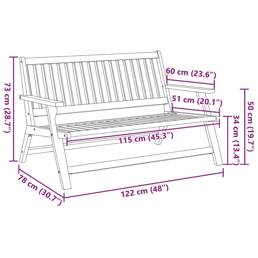 Diese Gartenbank aus massivem Akazienholz kombiniert Stil und Funktionalität und ist ein toller Ort zum Entspannen im Freien. Sie ist perfekt für Terrassen und Gärten und ihr traditionelles Design sowie die glatte Oberfläche laden zum Entspannen und Genießen der Natur mit Freunden und Familie ein. Stylisches Aussehen: Der klassische Stil verleiht jedem Außenbereich einen edlen Touch und bietet viel Platz. Robuste Haltbarkeit: Hergestellt aus massivem Akazienholz, dass der Witterung trotzt und dabei gut aussieht. Großzügige Größe: Mit 122.5 x 78 x 73 cm bietet sie Platz für zwei Erwachsene. Komfortmerkmale: Armlehnen und ein glattes Rückenteil erleichtern das Sitzen über längere Zeit. Stressfreies Reinigen: Die geölte Oberfläche macht es einfach, die Bank hübsch zu halten.