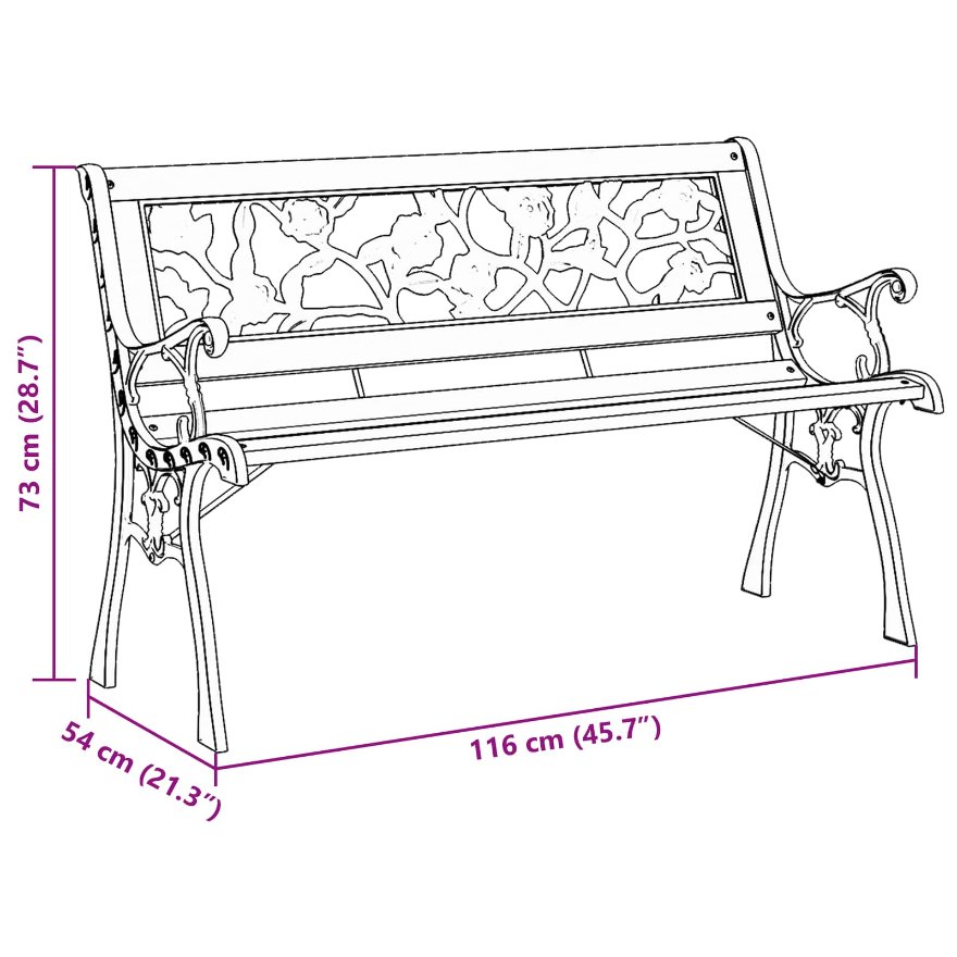 Diese Gartenbank ist genau das, was du für deinen Garten oder Außenbereiche brauchst. Sie verbindet Funktionalität mit Stil und wertet jeden Raum auf. Die Rosewood-Oberfläche und die feine Verarbeitung schaffen eine einladende Atmosphäre, perfekt, um frische Luft mit Freunden und Familie zu genießen. Robuste Bauweise: Hergestellt aus starkem Gusseisen und natürlichem Holz, ist diese Bank so gebaut, dass sie alle Wetterbedingungen aushält und dabei gut aussieht. Der Lack bietet zusätzlichen Schutz, wodurch sie ideal für den langfristigen Einsatz im Freien ist, mit minimalem Aufwand. Schickes Design: Das schöne Rosendesign wertet jeden Garten oder Balkon auf und macht ihn zu einem dekorativen Stück in deinem Außenbereich. Es kombiniert Charme und Komfort und verwandelt deinen Raum in eine entspannte Oase. Bequeme Sitzfläche: Platz für drei ist super für gesellige Treffen; die Bank lädt dazu ein, zurückzulehnen und zu relaxen. Ihre geschwungenen Linien und die glatte Oberfläche machen es leicht, es sich bequem zu machen. Einfache Pflege: Das clevere Design ermöglicht es, dass ein Wisch mit einem weichen Tuch ausreicht, um sie sauber zu halten. Lagere sie an einem trockenen Ort, wenn du sie nicht benutzen willst, damit sie schick aussieht. Multifunktional: Diese Gartenbank ist ideal für Gärten, Terrassen oder Balkone. Nutze sie zum Entspannen, Quatschen oder als dekoratives Element bei deinen Pflanzen, um das Gesamtbild deines Raums zu verbessern.