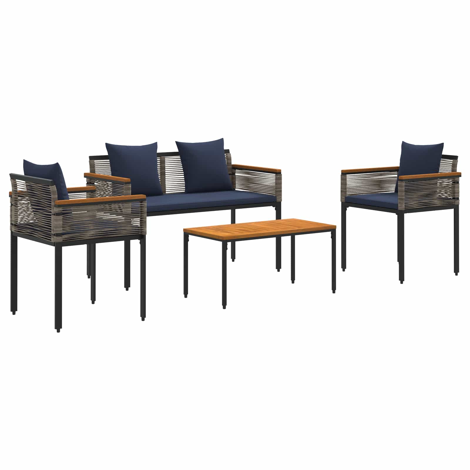 Dieses moderne Outdoor-Möbelset bringt Stil und Charme in jeden Garten oder auf jede Terrasse. Mit einem rustikalen Touch bietet es eine tolle Mischung aus schöner Optik und stabiler Bauweise und sorgt für eine einladende Atmosphäre. Egal ob man Freunde bewirtet oder einfach nur entspannt, es sieht einfach super aus und ist mega bequem! Die durchdachten Details, wie die geschmackvollen Armlehnen und der robuste Rahmen, bringen Funktionalität und Design in Einklang und machen deinen Außenbereich noch attraktiver. Hochwertige Materialien: Hergestellt aus PE-Rattan und pulverbeschichtetem Stahl, die wirklich langlebig und resistent gegen alle Wetterlagen sind. Diese Materialien vereinen das natürliche Aussehen von Rattan mit stabiler Bauweise! Qualitätskomponenten: Das Set kommt mit einem abnehmbaren Kissenbezug, der das Reinigen zum Kinderspiel macht. Der Kissenfüllung von leichtem Schaum und Faser sorgt für ultimativen Komfort. Und die quadratischen Beine in Kombination mit den ausgefallenen Armlehnen sehen einfach klasse aus! Ergonomische Merkmale: Mit nivellierbaren Füßen, die für Standfestigkeit sorgen, auch auf unebenen Flächen. So wird das Sitzen echt angenehm - ganz clever für den Außenbereich! Funktionale Nutzung: Ob im Garten oder auf der Terrasse, dieses Set ist die perfekte Kulisse für gesellige Runden oder einfach zum Entspannen. Der rustikale Look passt überall und bringt Charakter in dein Zuhause. Pflegehinweise: Um den schönen Zustand deines Sets zu erhalten, vermeide scharfe Chemikalien und wische es mit einem trockenen Tuch ab. Wenn es nicht in Gebrauch ist, zieh eine Abdeckplane drüber, um dem Wetter draußen nicht zu viel Gelegenheit zu geben. So bleibt dein Möbelset lange schön!