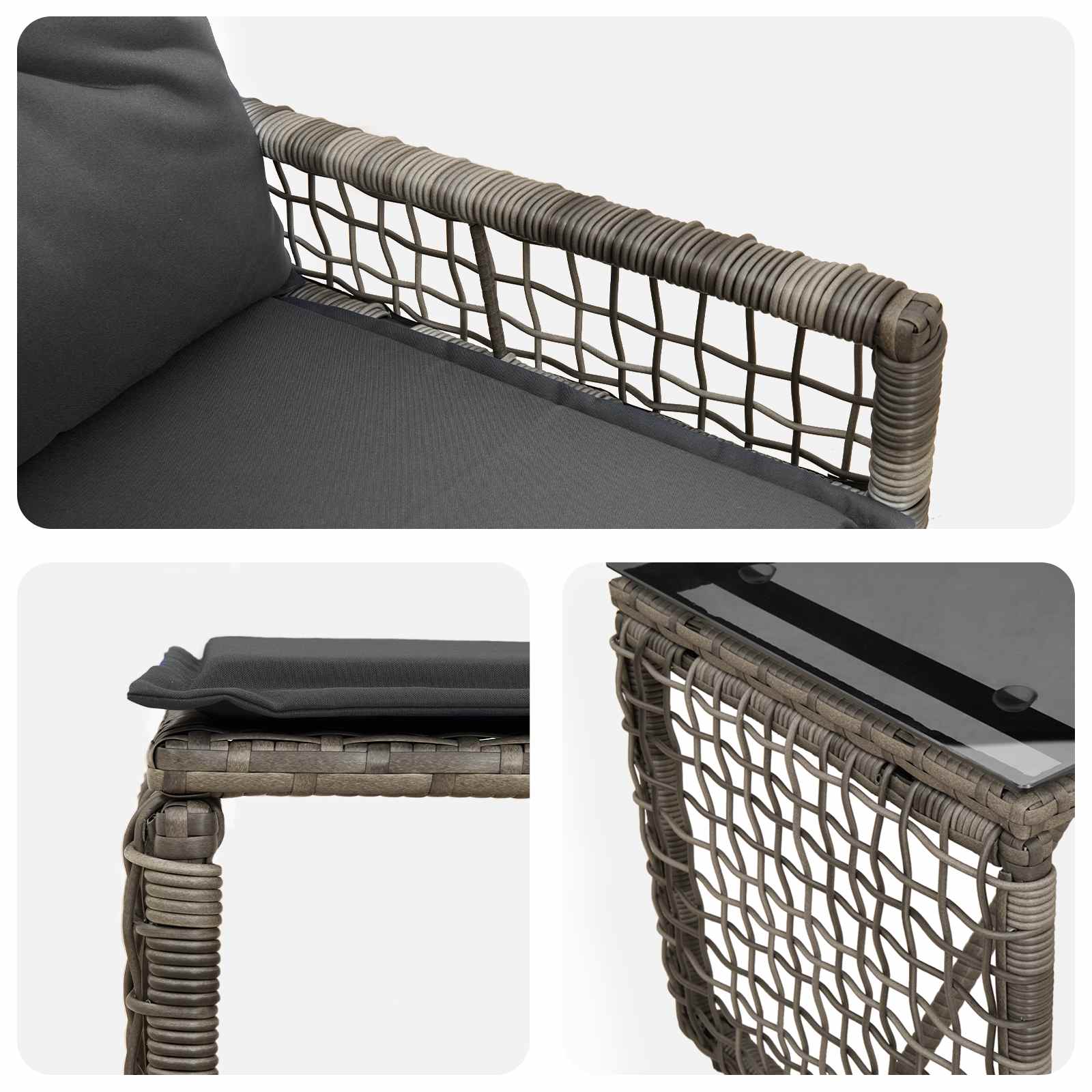 Dieses moderne Gartenmöbel-Set wurde für alle designt, die ihren Garten oder Balkon mit Stil und Funktion aufpeppen wollen. Ideal für Frühling und Sommer, bringt dieses schöne Set rustikalen Charme und einen Hauch von natürlicher Schönheit mit. Das hochwertige Poly-Rattan schafft eine schicke, entspannte Atmosphäre, während das kunstvolle Webmuster jedem Außenbereich eine elegante Note verleiht. Stell dir vor, du verbringst entspannte Nachmittage oder lebhafte Abende draußen in deinem Garten und hebt dein Freiluft-Erlebnis mit diesem vielseitigen und stylischen Set auf das nächste Level. Natürlicher Charme Das Set aus Poly-Rattan und soliden Akazienholzoberflächen bringt rustikalen Charme und moderne Eleganz in deinen Garten. Robuste Materialien sorgen dafür, dass es lange hält und gleichzeitig gut aussieht. Das Poly-Rattan verleiht einen lässigen Look, der sich perfekt in die Gartengestaltung einfügt, während die Akazienholzoberfläche Stabilität und tolles Design bietet. Umfassendes Design Mit einem ansprechend gestalteten Rücken, abnehmbaren Kissen und einem pulverbeschichteten Stahlrahmen ist alles für Qualität und Funktion ausgelegt. Armlehnen und trapezförmige Beine sorgen für Komfort und Stabilität. Der pulverbeschichtete Finish gibt zusätzlichen Schutz vor dem Wetter und hält das Möbelstück in top Zustand. Angenehmer Komfort und Stil Genieße gemütliches Sitzen mit den weichen Kissen, die für ein tolles Sitzgefühl sorgen. Die genähten Rückenkissen steigern den Komfort und passen super zu dem natürlichen Look des Sets. Vielseitig einsetzbar Dieses Set ist perfekt für draußen und bringt gemütlichen Komfort ins Freie. Egal ob beim entspannten Zusammensitzen oder feierlichen Anlässen, sein robustes Design hält dem Wetter stand und ist ideal für Garten- oder Balkonsommerfeste. Pflegeleicht Die Reinigung deiner Möbel ist super einfach: Wisch sie einfach mit einem feuchten Tuch ab und schütz sie bei schlechtem Wetter mit einer wasserdichten Abdeckung. So bleiben sie schön und langlebig.