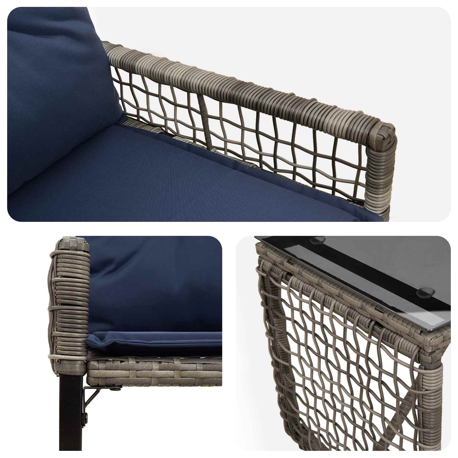 Dieses moderne Gartenmöbel-Set wurde für alle designt, die ihren Garten oder Balkon mit Stil und Funktion aufpeppen wollen. Ideal für Frühling und Sommer, bringt dieses schöne Set rustikalen Charme und einen Hauch von natürlicher Schönheit mit. Das hochwertige Poly-Rattan schafft eine schicke, entspannte Atmosphäre, während das kunstvolle Webmuster jedem Außenbereich eine elegante Note verleiht. Stell dir vor, du verbringst entspannte Nachmittage oder lebhafte Abende draußen in deinem Garten und hebt dein Freiluft-Erlebnis mit diesem vielseitigen und stylischen Set auf das nächste Level. Natürlicher Charme Das Set aus Poly-Rattan und soliden Akazienholzoberflächen bringt rustikalen Charme und moderne Eleganz in deinen Garten. Robuste Materialien sorgen dafür, dass es lange hält und gleichzeitig gut aussieht. Das Poly-Rattan verleiht einen lässigen Look, der sich perfekt in die Gartengestaltung einfügt, während die Akazienholzoberfläche Stabilität und tolles Design bietet. Umfassendes Design Mit einem ansprechend gestalteten Rücken, abnehmbaren Kissen und einem pulverbeschichteten Stahlrahmen ist alles für Qualität und Funktion ausgelegt. Armlehnen und trapezförmige Beine sorgen für Komfort und Stabilität. Der pulverbeschichtete Finish gibt zusätzlichen Schutz vor dem Wetter und hält das Möbelstück in top Zustand. Angenehmer Komfort und Stil Genieße gemütliches Sitzen mit den weichen Kissen, die für ein tolles Sitzgefühl sorgen. Die genähten Rückenkissen steigern den Komfort und passen super zu dem natürlichen Look des Sets. Vielseitig einsetzbar Dieses Set ist perfekt für draußen und bringt gemütlichen Komfort ins Freie. Egal ob beim entspannten Zusammensitzen oder feierlichen Anlässen, sein robustes Design hält dem Wetter stand und ist ideal für Garten- oder Balkonsommerfeste. Pflegeleicht Die Reinigung deiner Möbel ist super einfach: Wisch sie einfach mit einem feuchten Tuch ab und schütz sie bei schlechtem Wetter mit einer wasserdichten Abdeckung. So bleiben sie schön und langlebig.