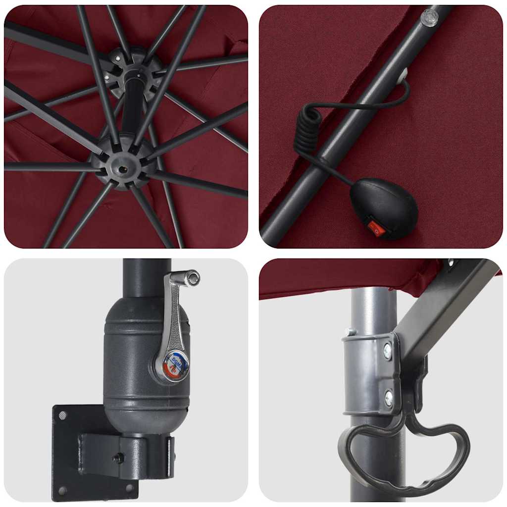 Dieser Gartenparasols ist genau das, was du suchst, um im Sommer kühl im Schatten zu bleiben. Er sieht stylisch aus und passt perfekt in moderne Gärten, sieht aber auch in traditionelleren Umgebungen gut aus. Er ist ideal für deine Sitz- oder Essbereiche, mit einem großen Schirmdach, das dich vor der Sonne schützt. Der glatte Polyesterstoff verleiht ihm eine schöne Note, und der robuste Stahlrahmen sorgt dafür, dass er lange hält. Polyesterstoff: Dieses Schirmdach ist aus hochwertigem Polyester gemacht, das hervorragend wasserabweisend ist und UV-Schutz bietet. Es blockiert starke Sonneneinstrahlung, sodass du dich entspannt zurücklehnen kannst. Das schicke Finish macht ihn zu einem stylischen Accessoire für jeden Außenbereich. Verstellbare Eigenschaften: Mit einer Handkurbel kannst du diesen Schirm ganz einfach öffnen und schließen. Die Neigefunktion erlaubt es dir, das Schirmdach optimal zu positionieren, um den besten Schutz zu haben. Diese praktischen Funktionen machen es leicht, den Schirm nach deinen Wünschen anzupassen. Integrierte LED-Beleuchtung: Die solarbetriebenen LED-Leuchten an der Unterseite des Schirmdachs sorgen für eine schöne Stimmung bei Abendveranstaltungen. Sie sind energieeffizient und verleihen deinem Außenbereich eine angenehme Atmosphäre, ohne dass du zusätzliche Stromquellen oder unordentliche Kabel brauchst. Pulverbeschichteter Stahlrahmen: Der stabile Stahlrahmen ist für den Einsatz im Freien konzipiert und sorgt für solide Stabilität und Langlebigkeit. Die Pulverbeschichtung schützt ihn vor Rost und lässt ihn gut aussehen. So wird der Schirm dir jahrelang Schatten spenden. Einfache Pflege: Halte ihn frisch mit ein paar einfachen Pflegemaßnahmen. Es ist klug, eine Abdeckung zu verwenden, wenn du ihn nicht brauchst, und das Schirmdach mit einer wasserabweisenden Sprühbehandlung zu versehen. Diese kleinen Schritte helfen, den Schirm in Topform zu halten, damit er dir lange Schatten und Licht bietet.