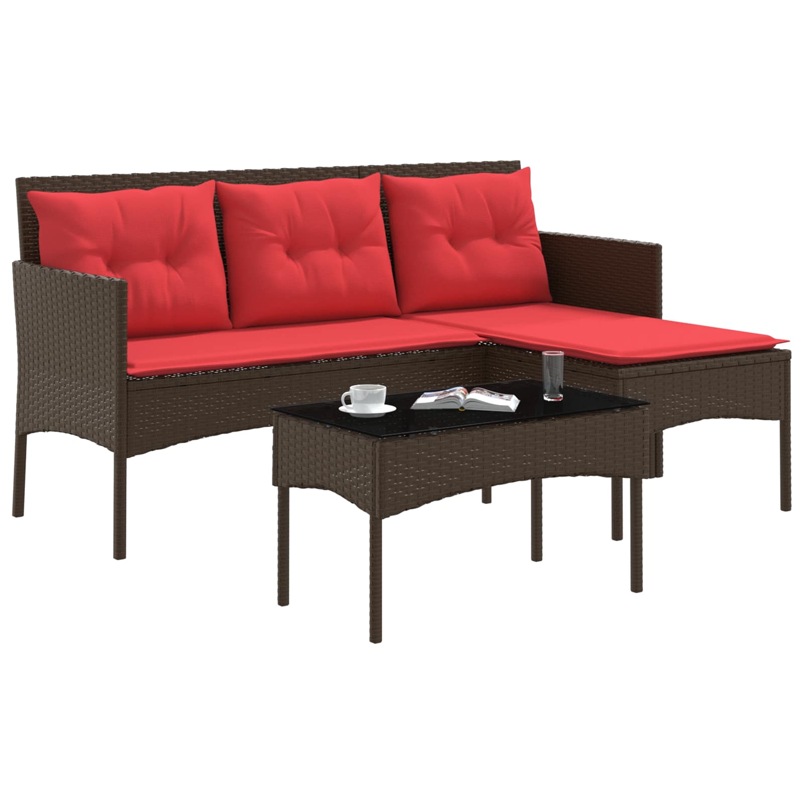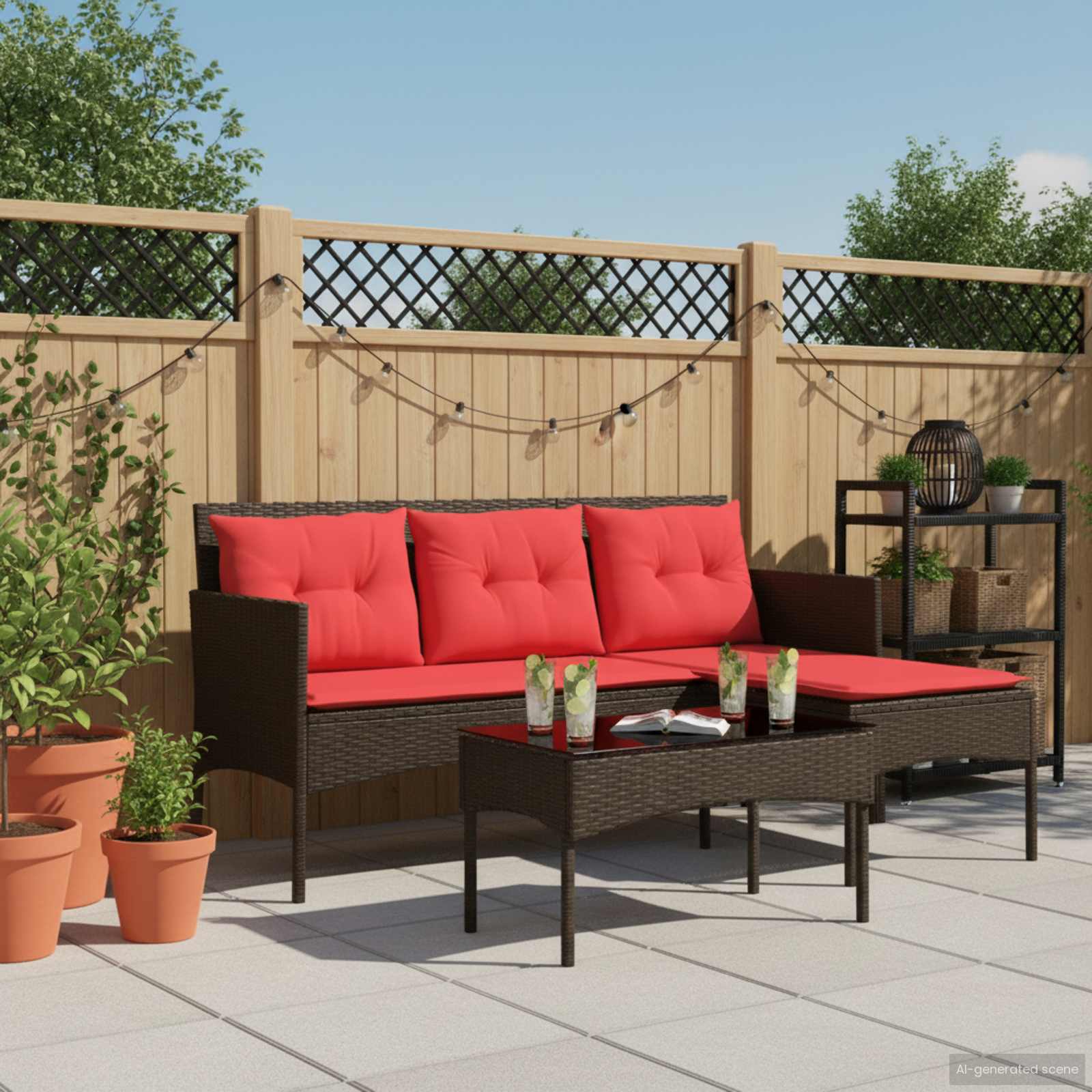 Dieses coole Garten-Sofa-Set bringt Komfort und Stil in deinen Außenbereich. Mit seinen klaren Linien und dem minimalistischen Design verwandelt es deinen Garten oder deine Terrasse schnell in einen gemütlichen Rückzugsort. Die L-Form ist super für Zusammenkünfte oder entspannte Momente alleine. Es verbindet Funktionalität und Eleganz perfekt - ideal für die Bewirtung von Gästen oder ruhige Stunden unter dem Himmel. Eine tolle Wahl für moderne Hausbesitzer, die zeitlos schönes Design suchen. Haltbares Poly-Rattan: Das Garten-Set besteht aus PE-Rattan, das für seine Widerstandsfähigkeit gegen schlechtes Wetter, von UV-Strahlen bis Regen, bekannt ist. Die Poly-Rattan-Komponenten sorgen für eine coole Textur und eine durchgängige Leistung über die Jahreszeiten und unterstützen sowohl die Funktionalität als auch die ansprechende Optik. Robuster pulverbeschichteter Stahlrahmen: Der pulverbeschichtete Stahlrahmen sorgt für eine stabile Struktur, die dir viele Jahre Freude im Freien bereitet. Die Pulverbeschichtung erhöht nicht nur die Haltbarkeit, sondern macht auch optisch was her und fügt sich super in dein modernes Außendekor ein. Glas-Tischoberfläche: Im Set ist ein Tisch mit Glasplatte enthalten, der das Gesamtbild aufwertet und Platz für Getränke, Deko oder Snacks bietet. Die saubere, reflektierende Oberfläche trägt zum modernen Look bei und passt perfekt zum Design des Sets. Bequeme Kissen: Die Polyesterkissen sorgen für komfortable Entspannung und laden dich ein, länger zu bleiben. Dank abnehmbarer Bezüge wird die Reinigung zum Kinderspiel. So kannst du immer frisch und sauber sitzen. Wichtige Pflegehinweise: Wische das Sofa-Set einfach mit einem feuchten Tuch ab und schütze es bei schlechtem Wetter mit einer wasserdichten Abdeckung. So bleibt es in Topform und sieht auch nach längerem Gebrauch noch toll aus.