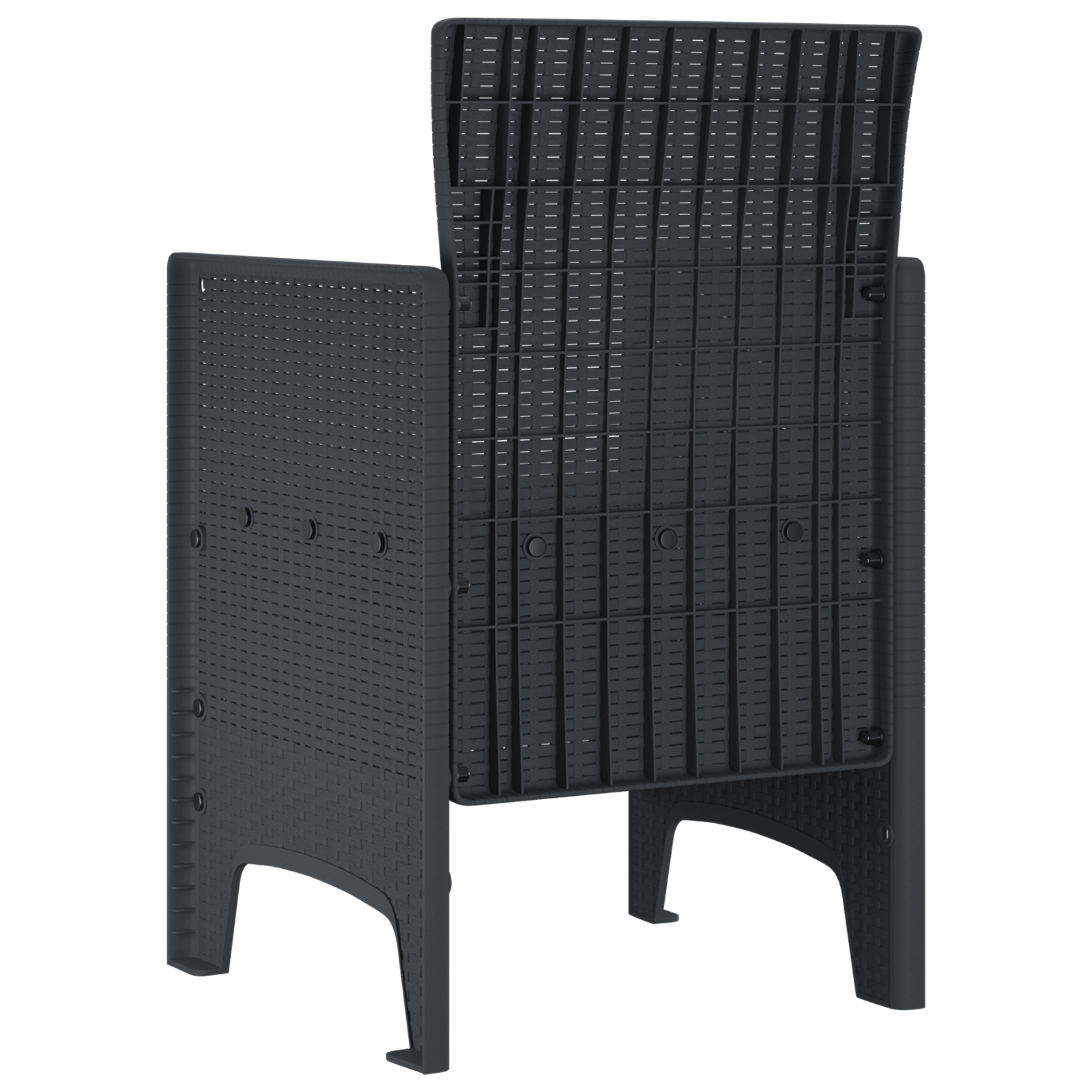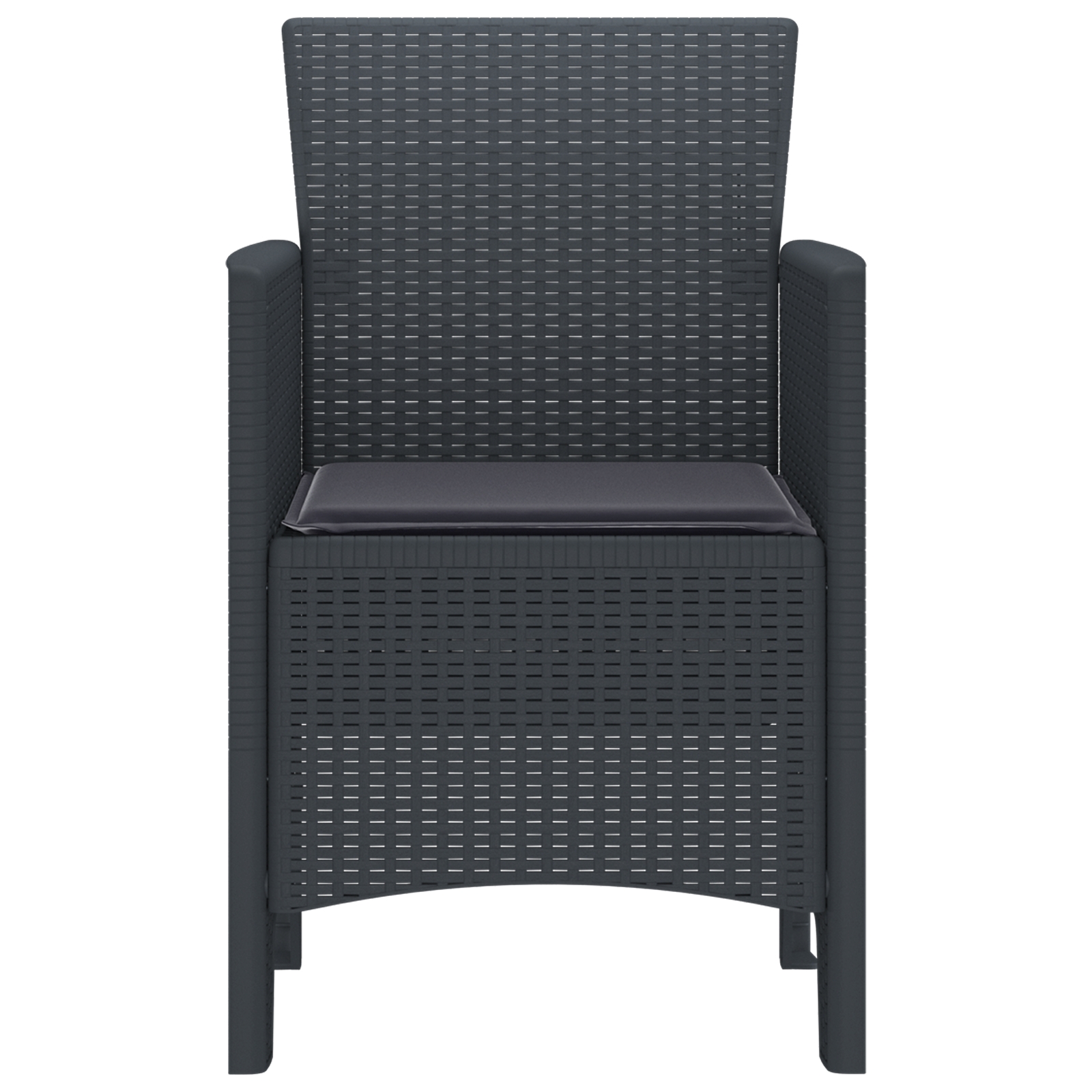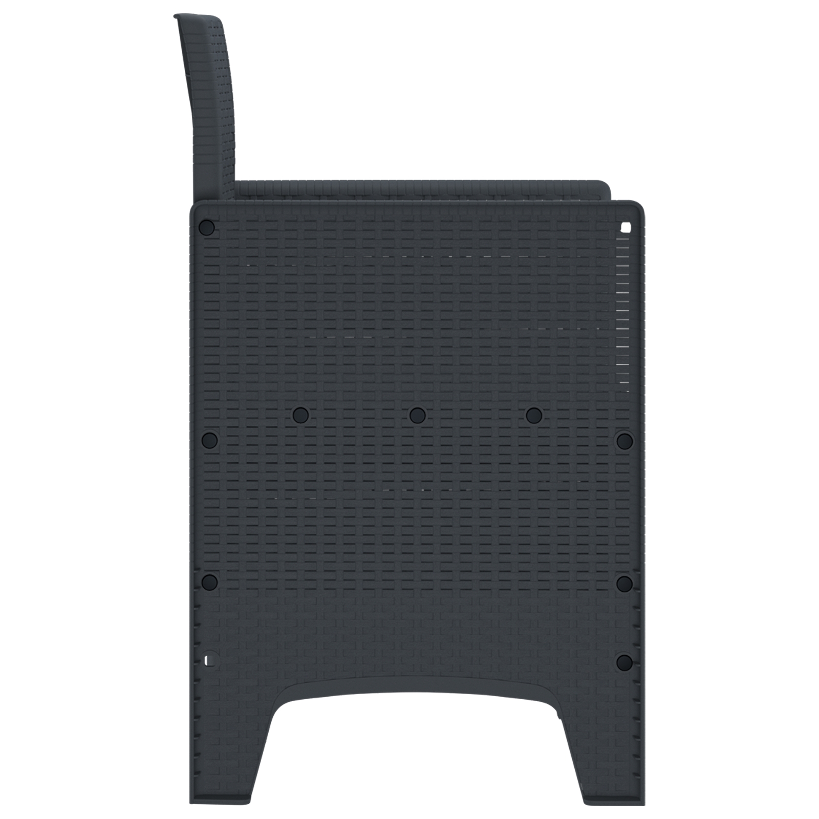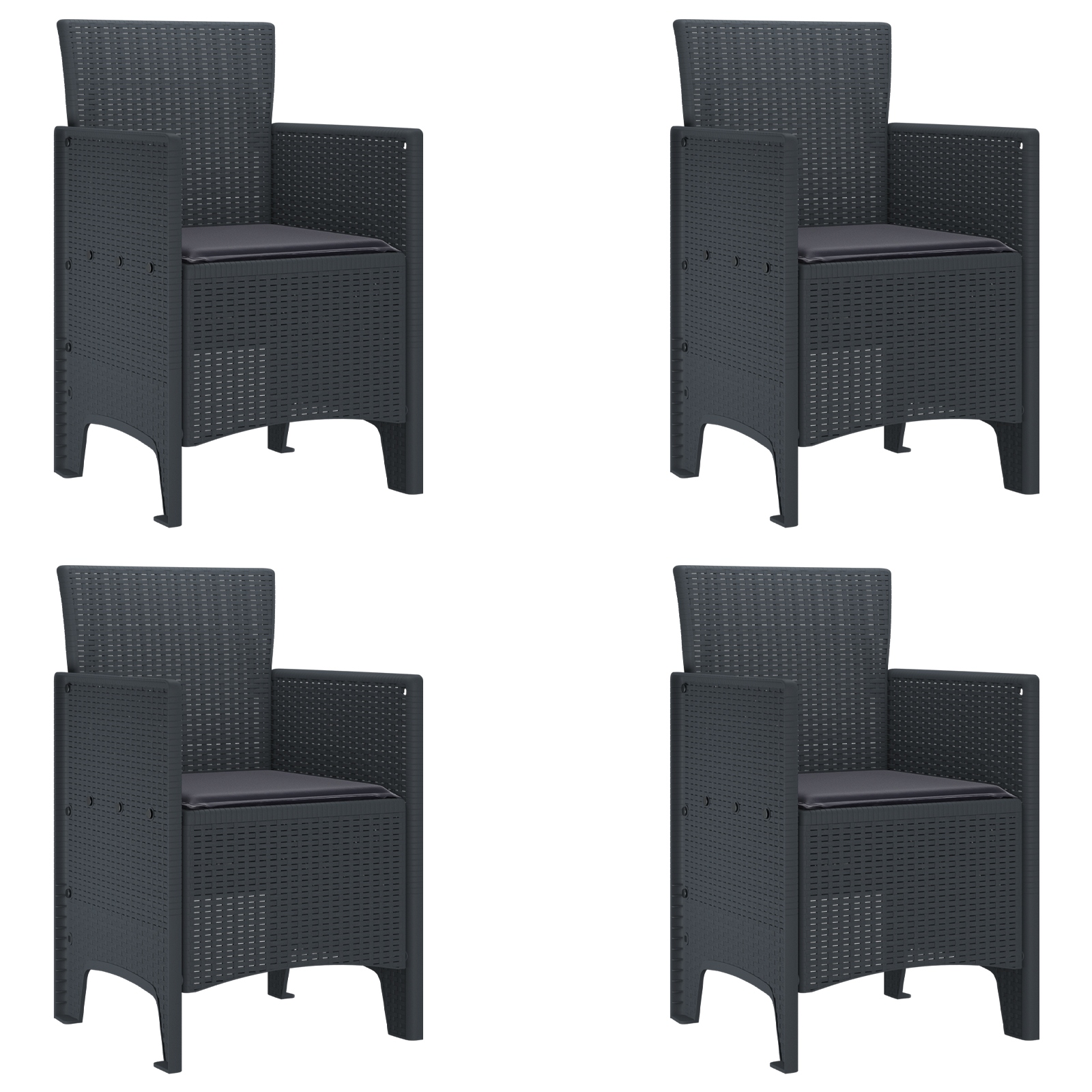Dieses Set mit vier Gartenstühlen vereint Stil und Komfort und ist perfekt, um Freunde zu empfangen oder einfach die Natur zu genießen. Hergestellt aus starkem synthetischem Poly-Rattan in schickem Anthrazit, bringen diese Stühle Farbe in jeden Außenbereich. Outdoor Haltbarkeit: Diese Stühle sehen nicht nur gut aus, sie sind auch bereit für den Außeneinsatz das ganze Jahr über. Leichte Konstruktion: Durch ihr leichtes Design kannst du dein Sitzlayout ganz einfach ändern. Einfach zu reinigen: Super pflegeleicht; einfach abwischen, um sie frisch zu halten. Bequeme Sitzgelegenheiten: Diese Stühle bieten Platz für bis zu vier Personen, also genug Raum für alle bei Outdoor-Events. Sichere Bequemlichkeit: Jeder Stuhl hält bis zu 100 kg, was für Stabilität und einladenden Komfort sorgt.