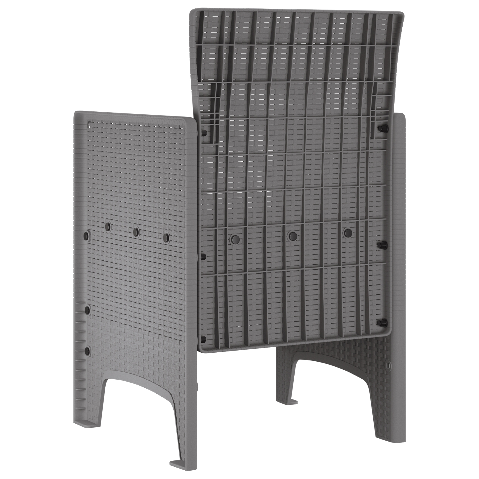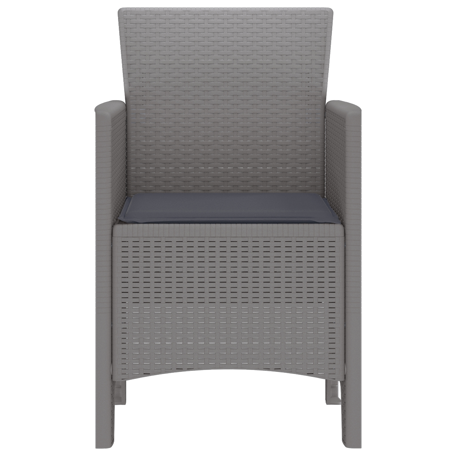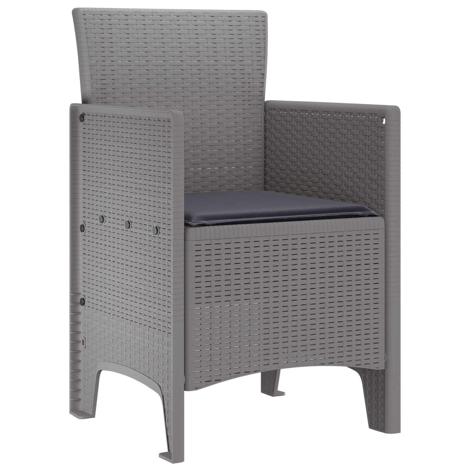 Dieses Set von Gartenstühlen ist praktisch und stylish, perfekt, um Zeit mit Familie und Freunden draußen zu genießen. Die hellgrauen Stühle aus robustem Kunststoff kommen mit anthrazitfarbenen Kissen und haben ein schickes, modernes Design, das zu jedem Balkon, jeder Terrasse oder jedem Garten passt. Outdoor-Dauerhaftigkeit: Diese Stühle sind für jeden Wetter gemacht und sehen auch nach längerer Nutzung gut aus, perfekt für den ganzjährigen Einsatz draußen. Leichte Konstruktion: Jeder Stuhl ist super leicht, was das Bewegen im Garten oder auf der Terrasse zum Kinderspiel macht. Einfach zu reinigen: Ein Wisch genügt, um die Stühle sauber zu halten, damit du mehr genießen und nicht putzen musst. Modernes Design: Das schlichte Design und die strukturierte Oberfläche verleihen deinem Außenbereich einen coolen Look. Stabiler Komfort: Diese Stühle sind für bis zu 100 kg pro Stück ausgelegt und bieten einen bequemen Platz zum Entspannen.