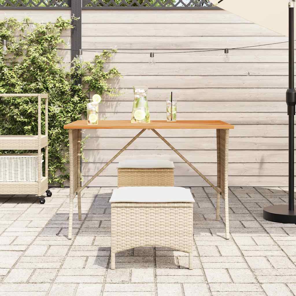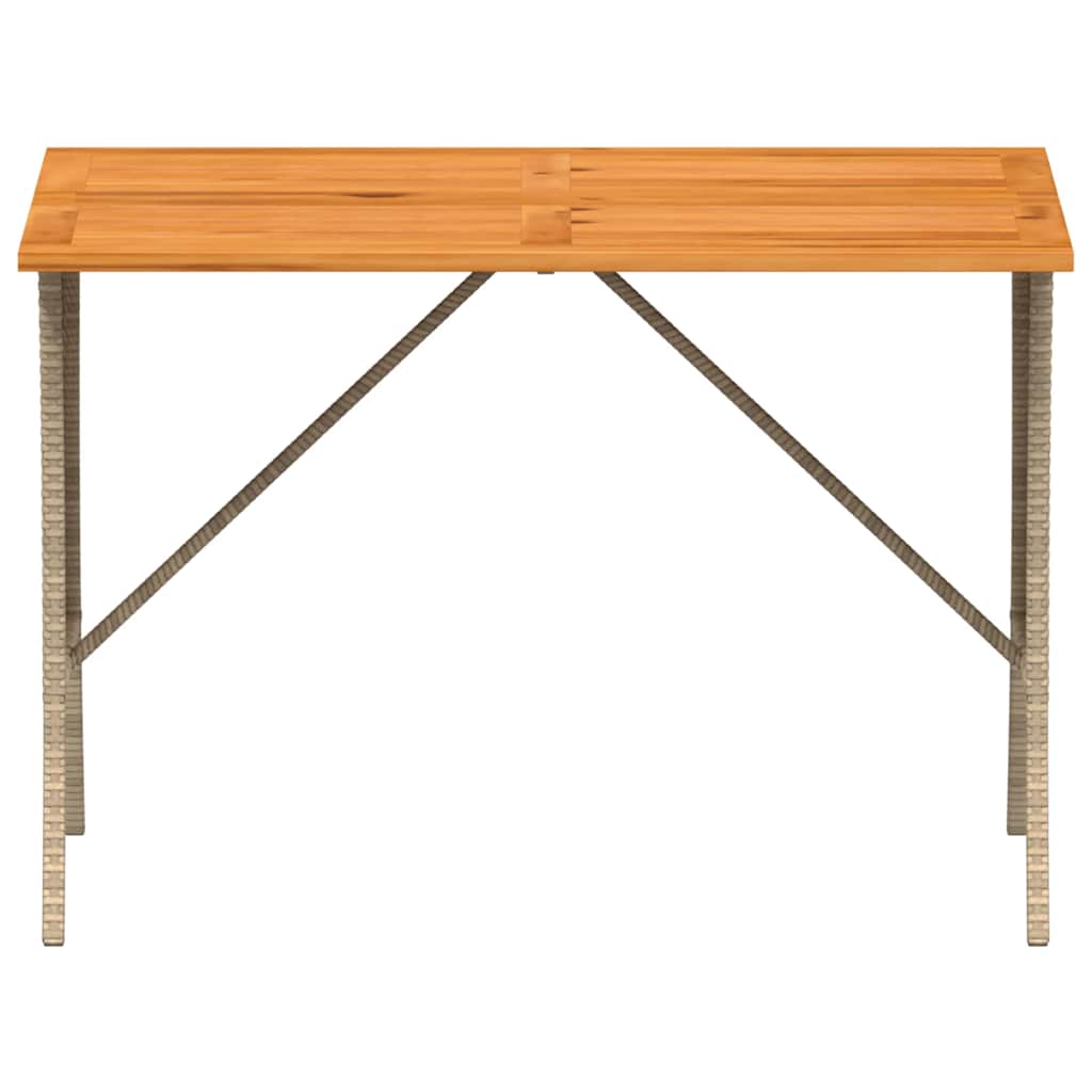 Mit seinen klaren Linien und seinem schlichten Design ist dieser Gartentisch mit Holzplatte eine ausgezeichnete Wahl für deinen Garten, deine Terrasse und andere Außenbereiche. Langlebiges Material: PE-Rattan, auch als Poly Rattan bekannt, ist ein robustes, pflegeleichtes synthetisches Material, das die Optik von natürlichem Rattan aufweist. Es kennzeichnet sich durch ein geringes Eigengewicht und lässt sich einfach reinigen. Aufgrund seiner Haltbarkeit und Witterungsbeständigkeit wird es häufig bei der Herstellung von Gartenmöbeln verwendet.Stabile und pflegeleichte Tischplatte: Dieser Gartentisch besitzt eine Tischplatte aus Akazienholz, die robust und langlebig ist und sich leicht mit einem feuchten Tuch reinigen lässt.Robuster und stabiler Rahmen: Dank des pulverbeschichteten Stahlrahmens ist das Möbelstück robust, stabil und für den täglichen Einsatz im Außenbereich geeignet. Gut zu wissen:Wir empfehlen dir, deine Gartenmöbel mit einer wasserdichten Hülle zu schützen, um lange Zeit eine ansprechende Optik aufzuweisen.