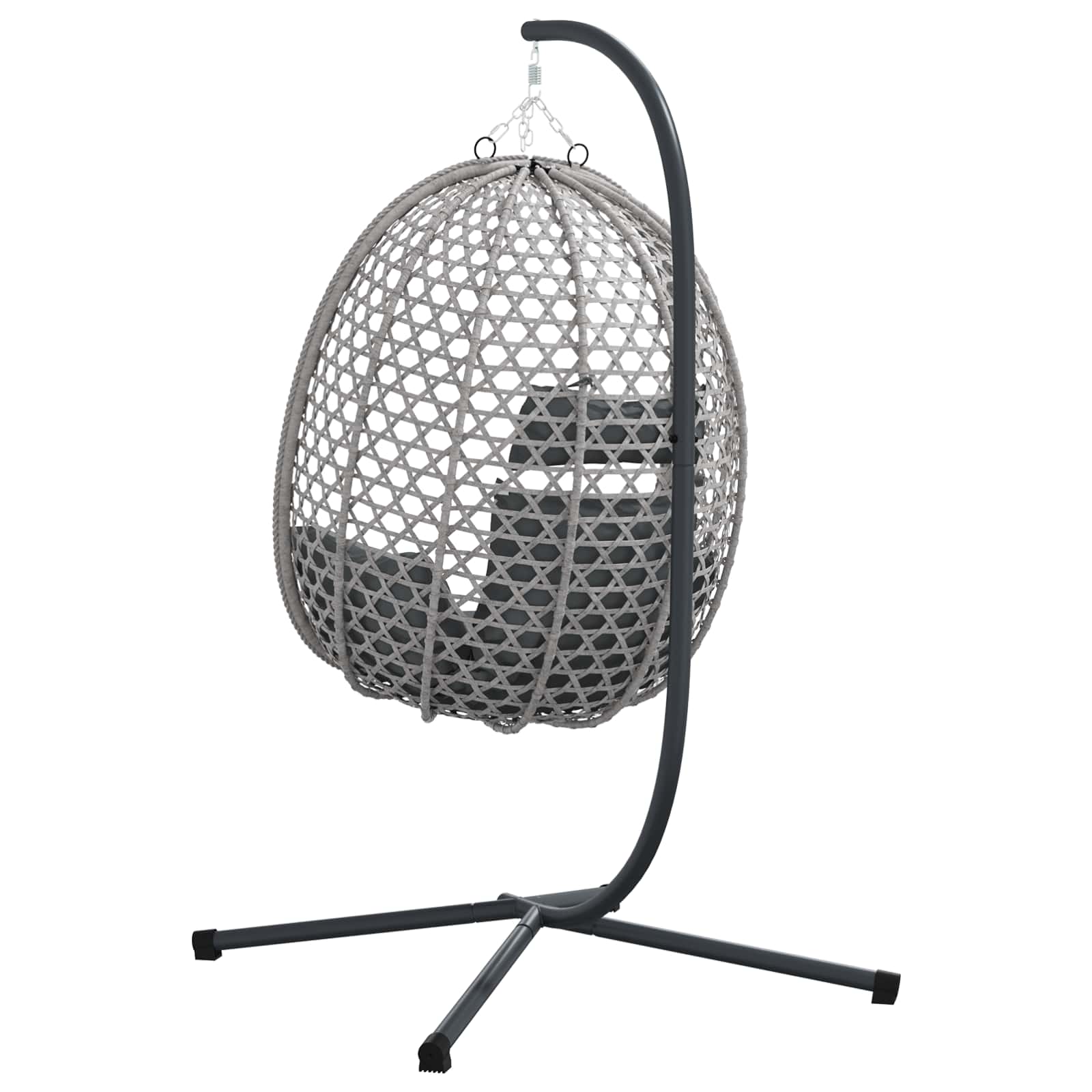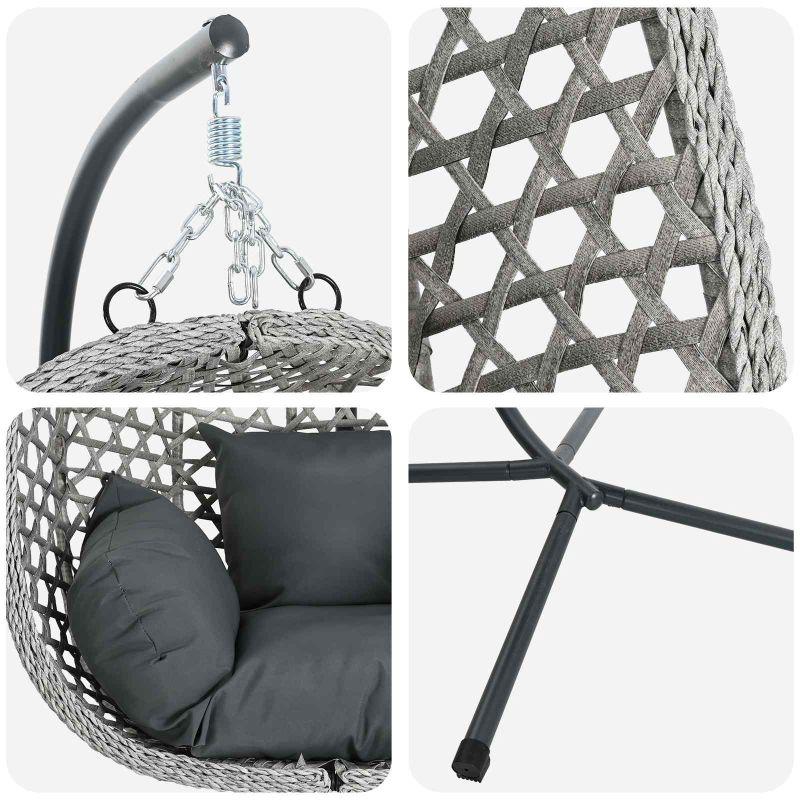 Dieser hängende Ei-Stuhl mit Ständer bringt frischen Schwung in deine Entspannungsbereiche. Er ist für alle, die ruhige Momente lieben, und hat ein modernes Design, das in jede Umgebung passt. Egal ob im Wohnzimmer, auf dem Balkon, im Garten oder auf der Terrasse – das Stück bietet dir einen ruhigen Platz, um dem Alltagsstress zu entfliehen. Die geschwungene Form des Stuhls umschließt dich und sorgt für ein bequemes Gefühl, während die starke Bauweise aus Poly-Rattan ein stabiles Relax-Erlebnis liefert. Das bequeme Kissen macht ihn zur perfekten Oase nach einem langen Tag. Haltbare Poly-Rattan Struktur: Dieser hängende Ei-Stuhl ist aus hochwertigem Poly-Rattan, leicht und wetterfest. Er hält sowohl draußen als auch drinnen gut aus und ist die perfekte Sitzgelegenheit für den Sommer. Das strapazierfähige Material ist pflegeleicht, sodass du mehr Zeit mit Entspannen als mit Instandhalten verbringen kannst. Ergonomische Design-Vorteile: Der hängende Ei-Stuhl ist so gestaltet, dass er den Komfort in den Vordergrund stellt. Seine Form schmiegt sich an dich und sorgt für eine ergonomische Sitzposition, die Druckstellen lindert und die Haltung unterstützt. So bleibt der Sitz auch bei längerem Verweilen angenehm und ist ideal für entspannte Stunden. Platzsparende Faltfunktion: Das clevere Falt-Design macht es einfach, den Stuhl zu verstauen oder zu transportieren – perfekt für alle, die ihre Räume oft umgestalten. Wenn er nicht gebraucht wird, kann der Stuhl kompakt zusammengeklappt werden, um deinen Wohnraum ordentlich zu halten oder Platz auf dem Balkon zu schaffen. Vielseitige Platzierungsoptionen: Egal wo du entspannen möchtest – dieser hängende Ei-Stuhl passt in diverse Umgebungen, in deinem Wohnzimmer oder auf einer sonnenbeschienenen Terrasse. Sein modernes Design ergänzt jedes Dekor und gibt dir die Freiheit, deinen Raum individuell zu gestalten. Wesentliche Komponenten enthalten: Der hängende Ei-Stuhl wird komplett mit Ständer, Kopfstütze und einem bequemen Kissen geliefert. Diese Elemente garantieren Stabilität und Komfort, sodass du alles hast, was du brauchst, um diesen Stuhl von Anfang an zu genießen – ohne zusätzliche Käufe.