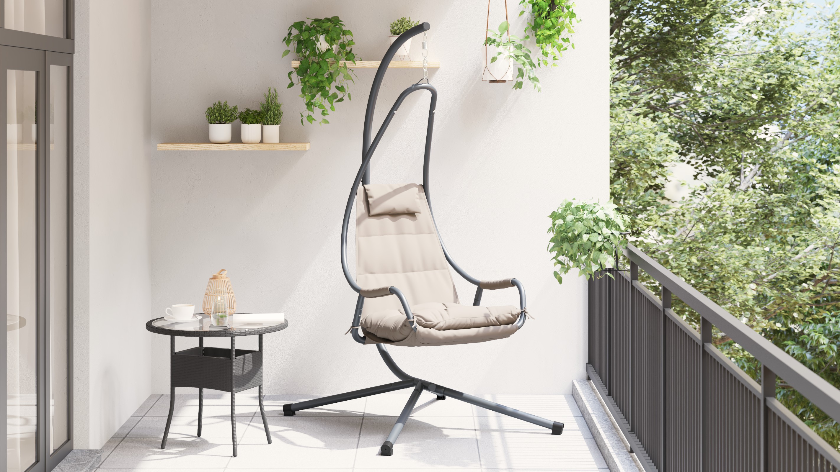Dieser Hängesessel ist eine großartige Mischung aus Komfort und Stil, perfekt für entspannende Momente auf deinem Balkon oder deiner Terrasse. Der schlanke taupe Stahlrahmen und der weiche Polyester-Sitz schaffen einen einladenden Ort, um sonnige Sommerabende oder gemütliche Nachmittage zu genießen. Höhenverstellbare Eigenschaften: Genieße besten Komfort mit Armlehnen, die du einfach nach deinem Wunsch einstellen kannst. So findest du die optimale Liegeposition. Geräumige Kapazität: Für bis zu drei Personen gebaut, ist diese Schaukel perfekt, um Zeit mit Freunden oder Familie zu genießen. Modernes Design: Sein trendiges Aussehen passt wunderbar in deinen Außenbereich und gibt deinem Garten oder Balkon einen frischen Look. Ein stilvolles Zentrum für deine Outdoor-Treffen. Einfache Montage: Kommt mit allem, was du für die Montage brauchst, und klaren Anleitungen, was den Aufbau super einfach macht. Du wirst ihn im Handumdrehen genießen! Perfekt für Entspannung: Speziell für draußen gemacht, ist dieser Stuhl genau das, was du brauchst, um einen ruhigen Rückzugsort in deinem Garten oder auf dem Balkon zu schaffen.