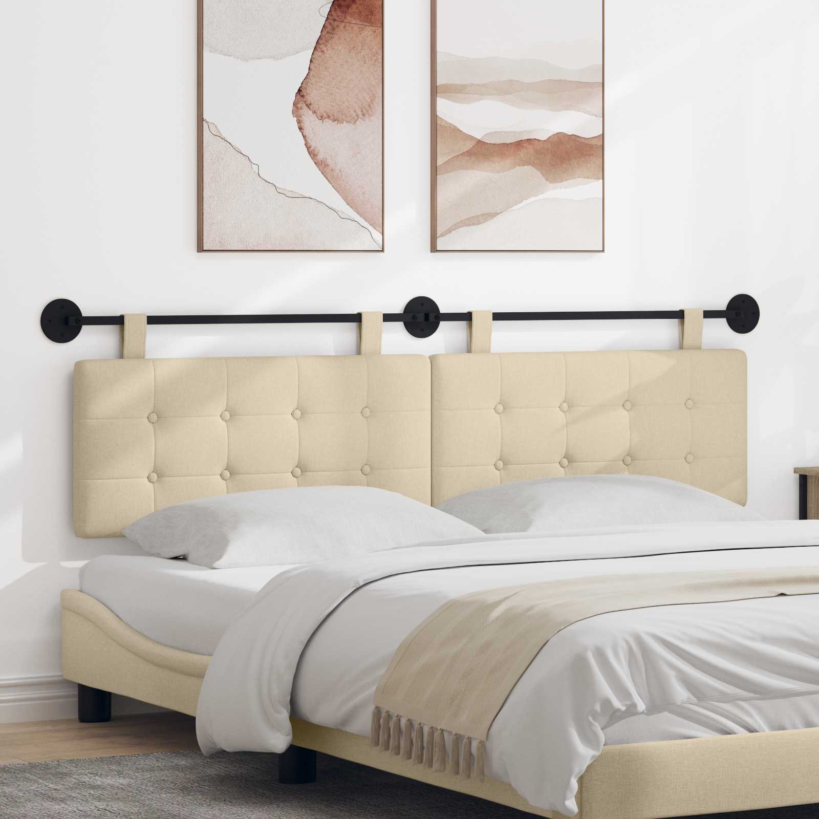 Das hängende Kopfteil ist die moderne Lösung für Ihr Schlafzimmer, mit einem klaren, schnittigen Design. Es ist perfekt, um Eleganz und Funktionalität hinzuzufügen und verwandelt jeden Raum in eine luxuriöse Umgebung. Ob für Ihr Hauptschlafzimmer oder das Gästezimmer, es dient sowohl als Blickfang als auch als funktionales Möbelstück, das Nähe und Stil vereint. Materialien: Dieses Kopfteil aus Stoff hat eine tolle, weiche Oberfläche, die einladend ist. Das gepresste Holz sorgt für Stabilität und Langlebigkeit, was es zur perfekten Wahl für jedes Zuhause macht. Diese Stoffe zusammen bieten eine schicke und langlebige Lösung für Ihr Schlafzimmer. Enthaltene Komponenten: Im Kopfteil-Set sind eine pulverbeschichtete Halterung, zwei runde Platten und zwei lange abnehmbare Gurte enthalten, die zusammen flexible Wandmontage ermöglichen und Stabilität sowie Anpassungsfähigkeit bieten. Außerdem gibt es umfassendes Zubehör zur einfachen Montage. Funktionen / Funktion / Design: Mit seinem hängenden Design wird das Kopfteil sicher an der Wand befestigt. Die weiche Polsterung bietet zusätzlichen Komfort und der atmungsaktive Stoff ist angenehm auf der Haut. Der stabile, abnehmbare Gurt sorgt für Vielseitigkeit und macht es anpassungsfähig für Ihren Raum. Empfohlene Verwendungszwecke: Ideal für verschiedene Schlafzimmer, bietet das Kopfteil sowohl Komfort als auch Stil. Sein modernes Design passt perfekt in zeitgenössische Räume und verleiht einen schlanken, modernen Look, der gut zu vielen Dekoren passt. Pflege & Wartung: Die Pflege ist ganz einfach: Wischen Sie das Kopfteil mit einem trockenen Tuch ab, um Staub zu entfernen. Vermeiden Sie aggressive Chemikalien, um die Stoffstruktur zu erhalten.