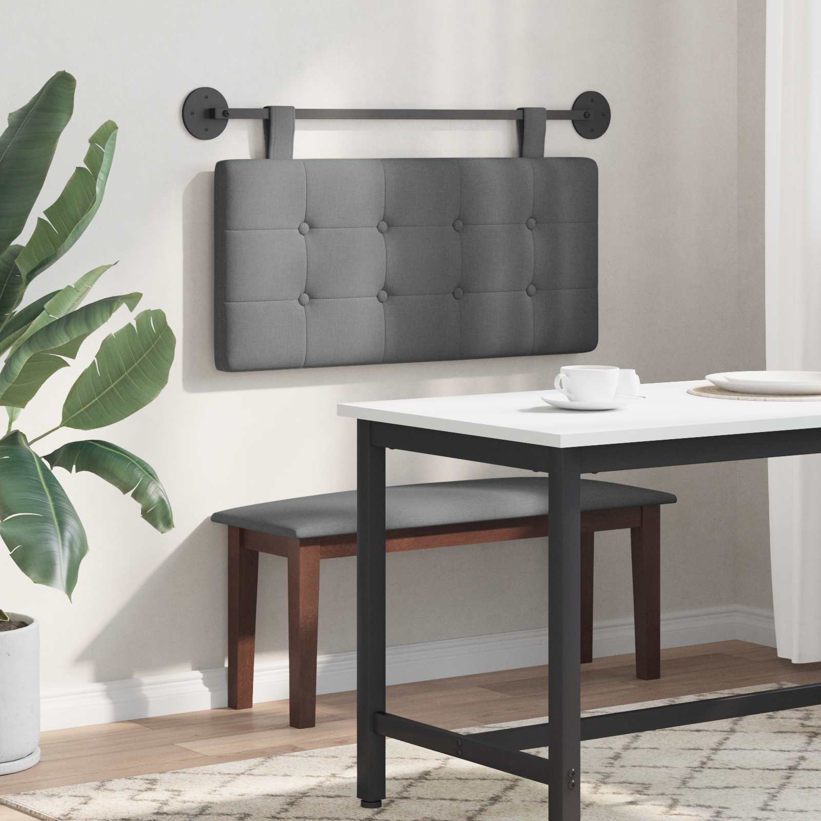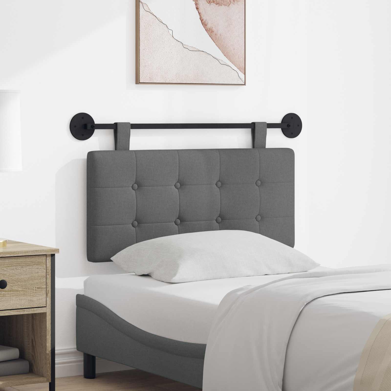 Das hängende Kopfteil ist die moderne Lösung für Ihr Schlafzimmer, mit einem klaren, schnittigen Design. Es ist perfekt, um Eleganz und Funktionalität hinzuzufügen und verwandelt jeden Raum in eine luxuriöse Umgebung. Ob für Ihr Hauptschlafzimmer oder das Gästezimmer, es dient sowohl als Blickfang als auch als funktionales Möbelstück, das Nähe und Stil vereint. Materialien: Dieses Kopfteil aus Stoff hat eine tolle, weiche Oberfläche, die einladend ist. Das gepresste Holz sorgt für Stabilität und Langlebigkeit, was es zur perfekten Wahl für jedes Zuhause macht. Diese Stoffe zusammen bieten eine schicke und langlebige Lösung für Ihr Schlafzimmer. Enthaltene Komponenten: Im Kopfteil-Set sind eine pulverbeschichtete Halterung, zwei runde Platten und zwei lange abnehmbare Gurte enthalten, die zusammen flexible Wandmontage ermöglichen und Stabilität sowie Anpassungsfähigkeit bieten. Außerdem gibt es umfassendes Zubehör zur einfachen Montage. Funktionen / Funktion / Design: Mit seinem hängenden Design wird das Kopfteil sicher an der Wand befestigt. Die weiche Polsterung bietet zusätzlichen Komfort und der atmungsaktive Stoff ist angenehm auf der Haut. Der stabile, abnehmbare Gurt sorgt für Vielseitigkeit und macht es anpassungsfähig für Ihren Raum. Empfohlene Verwendungszwecke: Ideal für verschiedene Schlafzimmer, bietet das Kopfteil sowohl Komfort als auch Stil. Sein modernes Design passt perfekt in zeitgenössische Räume und verleiht einen schlanken, modernen Look, der gut zu vielen Dekoren passt. Pflege & Wartung: Die Pflege ist ganz einfach: Wischen Sie das Kopfteil mit einem trockenen Tuch ab, um Staub zu entfernen. Vermeiden Sie aggressive Chemikalien, um die Stoffstruktur zu erhalten.
